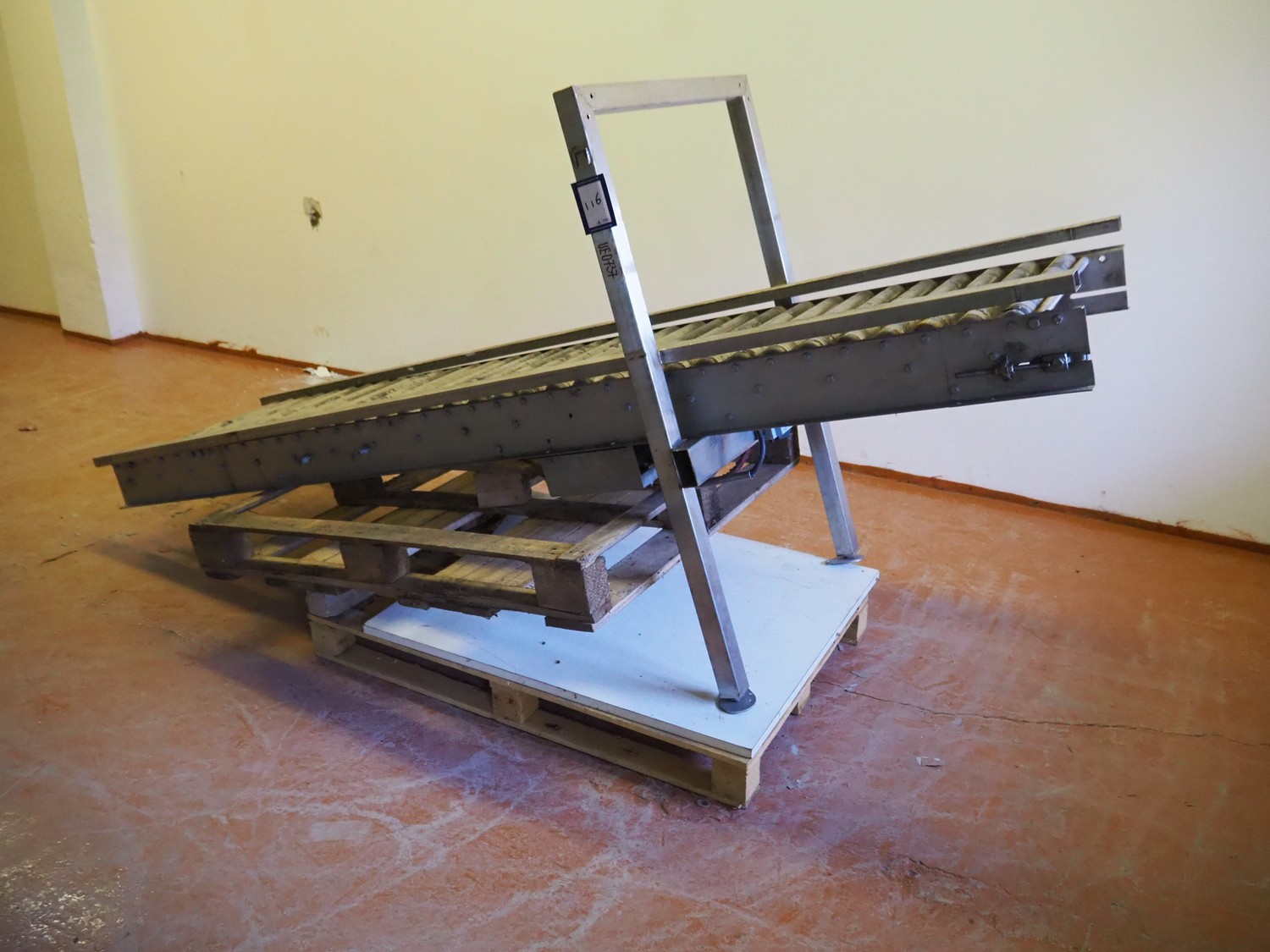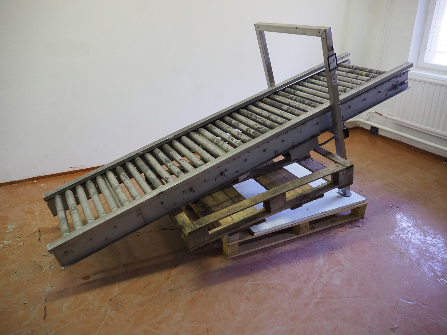 Driven roller conveyor, steel frame, steel rollers, roller width: 580 mm, total dimensions: 2750 mm x 830 mm x 1300 mm. Technical condition unknown.