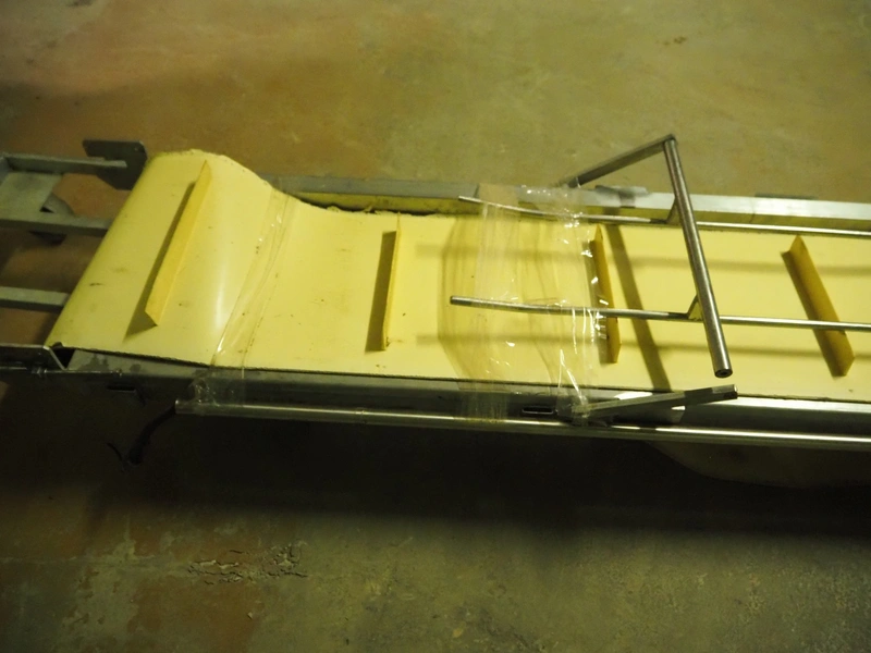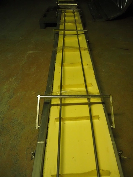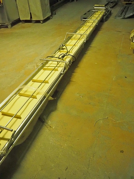 Transport belt with dividers, s/s frame, plastic belt, belt width: 340 mm, distance between dividers: 300 mm, divider height: 30 mm, total dimensions: 6500 mm x 350 mm x 300 mm. Incomplete, technical condition unknown.