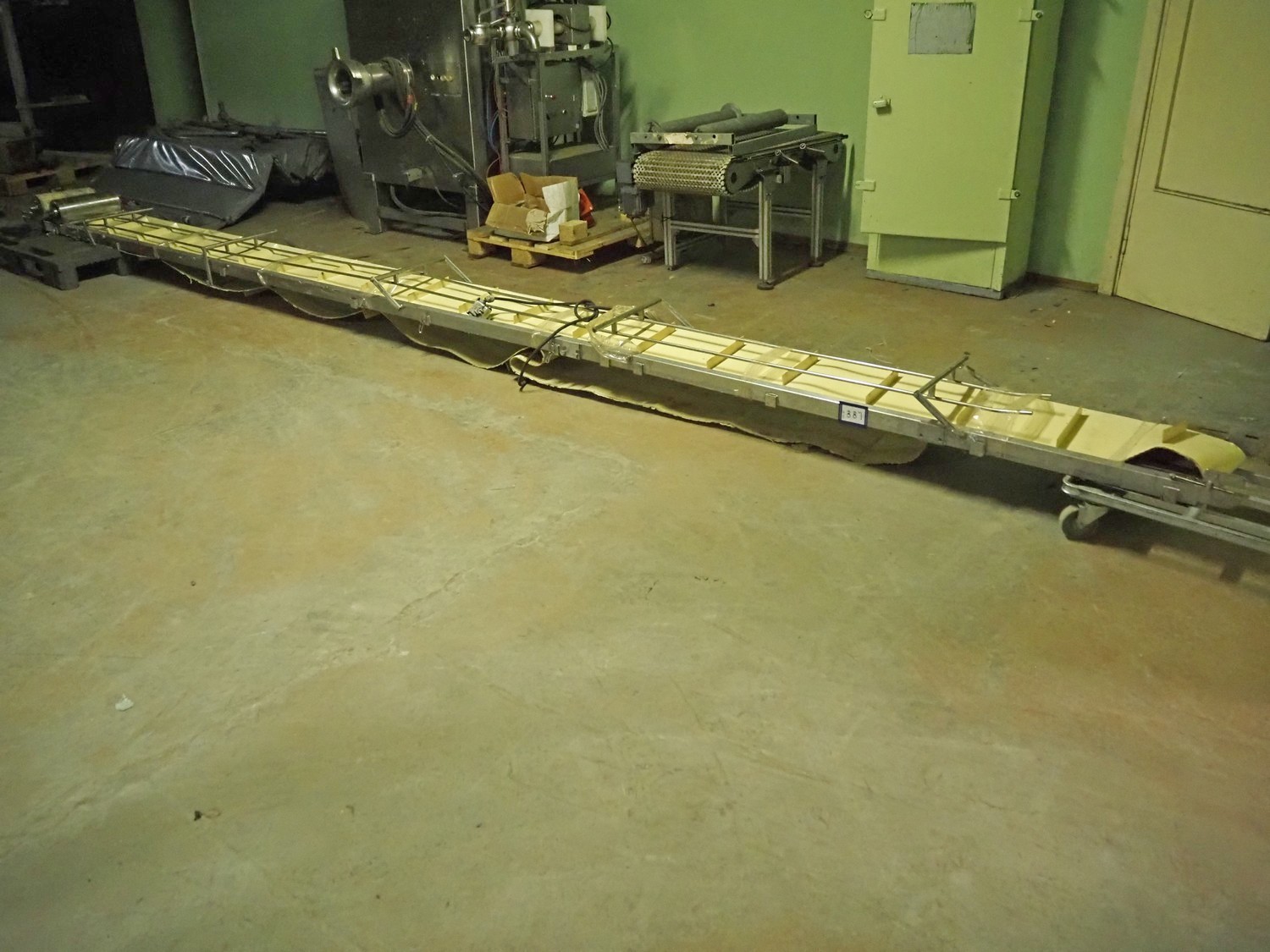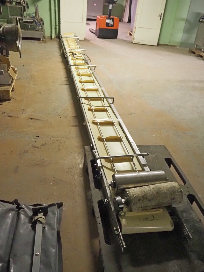 Transport belt with dividers, s/s frame, plastic belt, belt width: 340 mm, distance between dividers: 300 mm, divider height: 30 mm, total dimensions: 6500 mm x 350 mm x 300 mm. Incomplete, technical condition unknown.