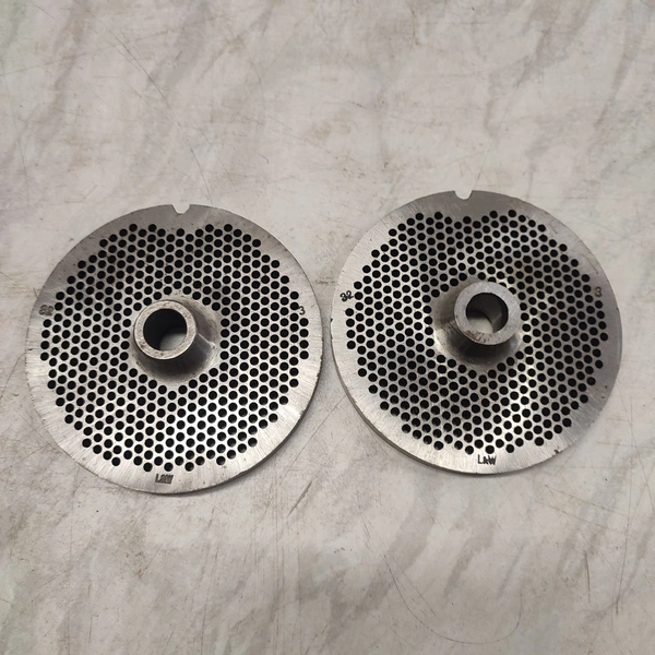 6 Lumbeck & Wolter grinder plates, size: 32, plate diameter: 100 mm, Ø centre hole: 13 mm, hole plate: 3.0 mm, thickness: (2x) 9 mm, (4x) 10 mm, total dimensions: 160 mm x 110 mm x 100 mm.