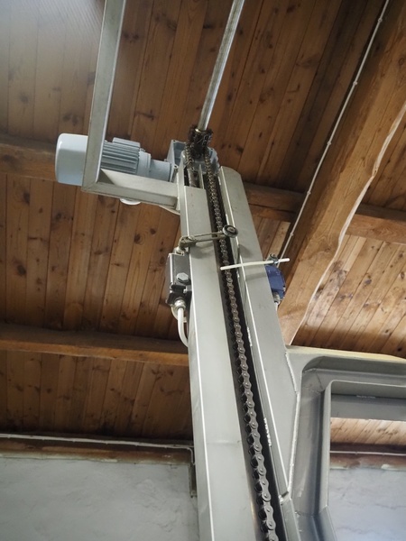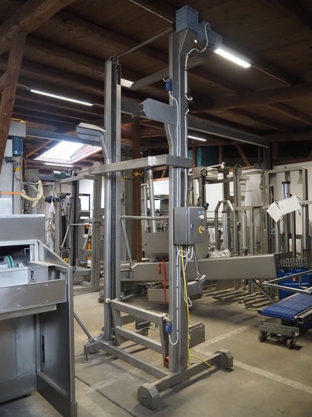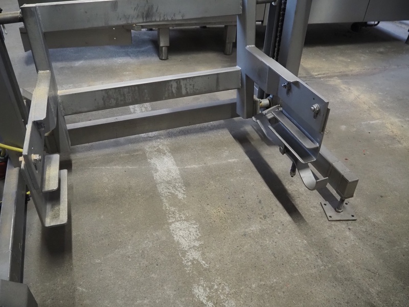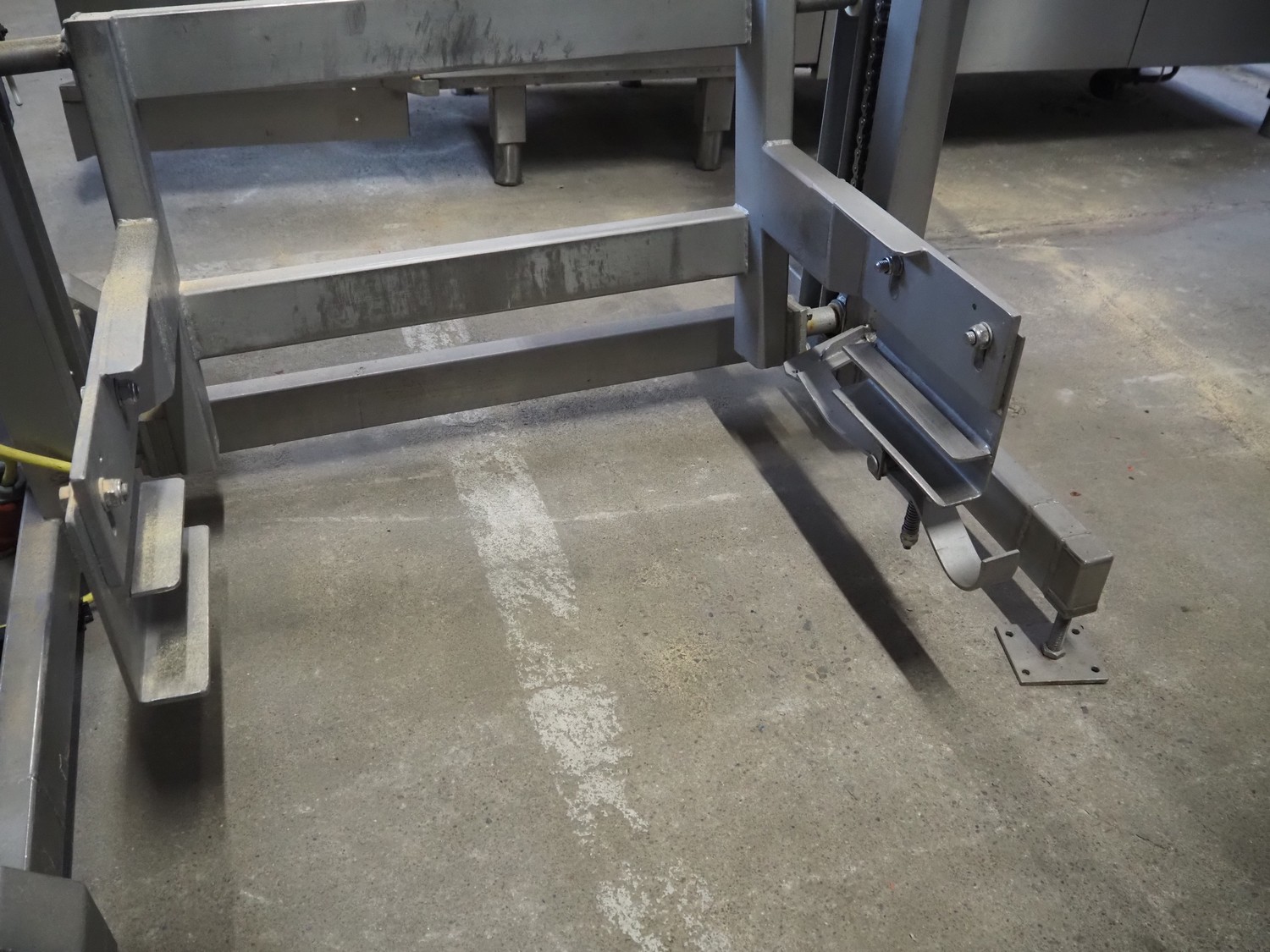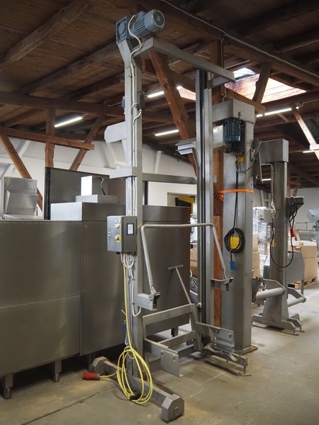 S/s mobile lifter for 200 liter meat bins, lifting height: 2280 mm, total dimensions: 1440 mm x 1350 mm x 3200 mm.