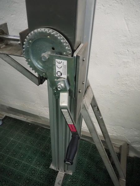 Mobile lifter for film reels, maximum lifting height: 1400 mm, maximum load capacity: 320 kg, distance between holder: 350 mm, total dimensions: 1250 mm x 750 mm x 1680 mm.