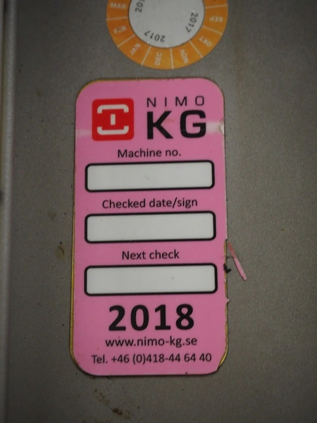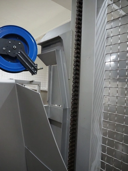 Nimo KG lifter for pallet boxes, type: SK 800 MK 2, serial number: 11968, year of construction: 2014, 400 V, 3 Ph, 50 Hz, 3.55 A, maximum capacity: 800 kg, clearance: 1250 mm x 1000 mm x 900 mm, lifting height: 2070 mm, total dimensions: 2050 mm x 1750 mm x 3450 mm.