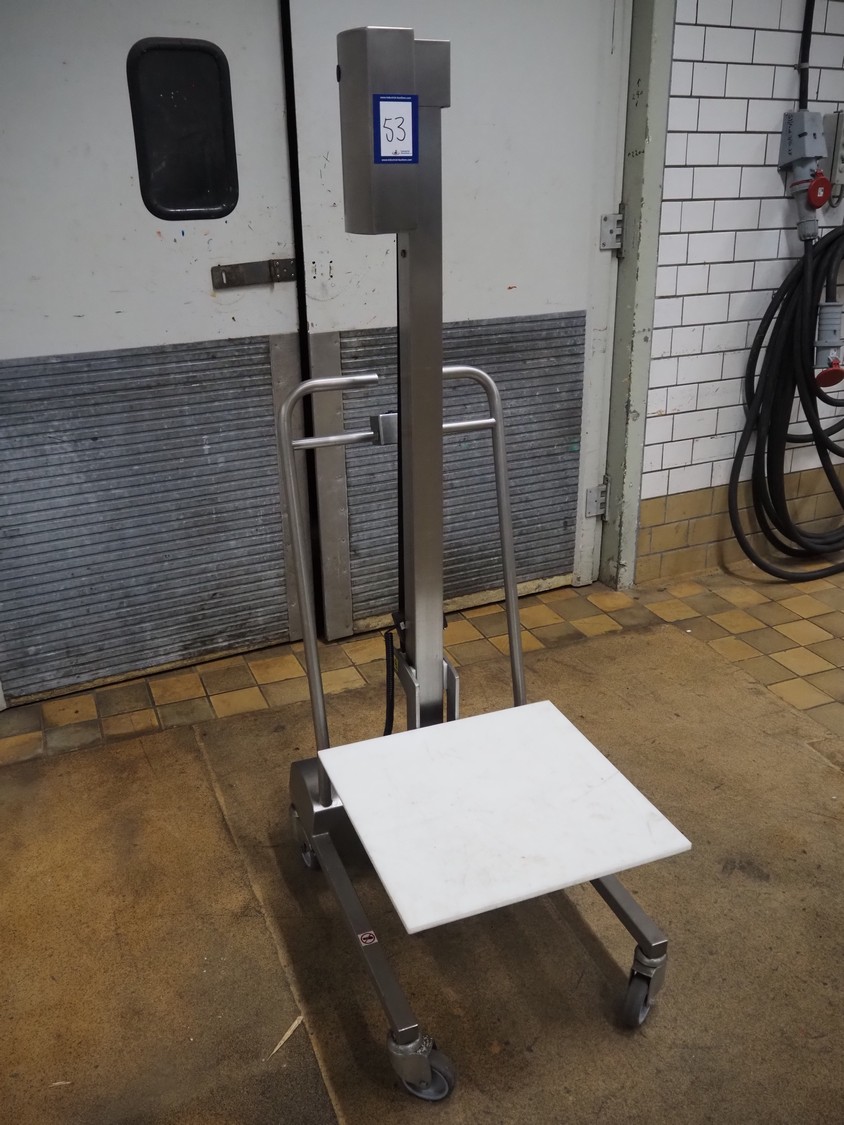 Svenema AB mobile lifter, product: Lyftvagn MIDI, model: 90 004, serial number: 30502-01, year of construction: 19/09/2005, 2x 12 V, 6.5 Ah, maximum capacity: 80 kg, weight: 39 kg, lifting height: 1530 mm, dimensions platform: 500 mm x 500 mm, total dimensions: 740 mm x 500 mm x 1650 mm.