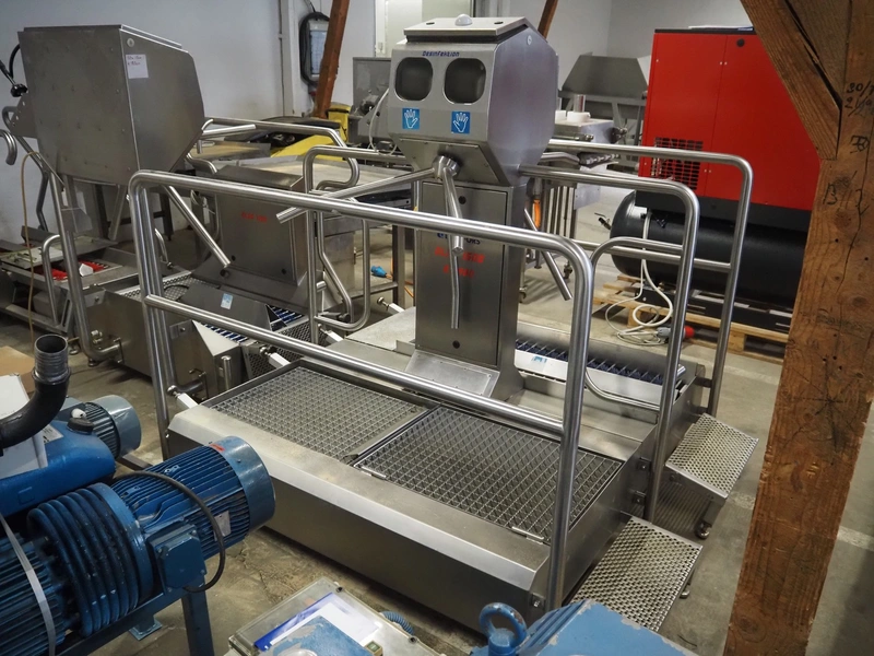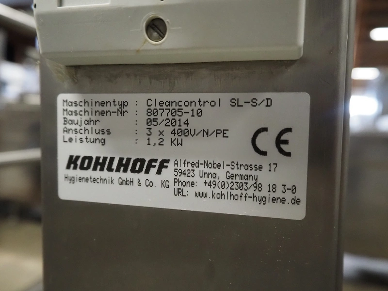 Kohlhoff hygiene station with tourniquet, sole cleaner and hand disinfection unit, type: Cleancontrol SL-S/D, machine number: 807705-10, year of construction: 05/2014, 400 V, 3 Ph, 1.2 kW, brush length: 1100 mm, total dimensions: 2100 mm x 1800 mm x 1800 mm.