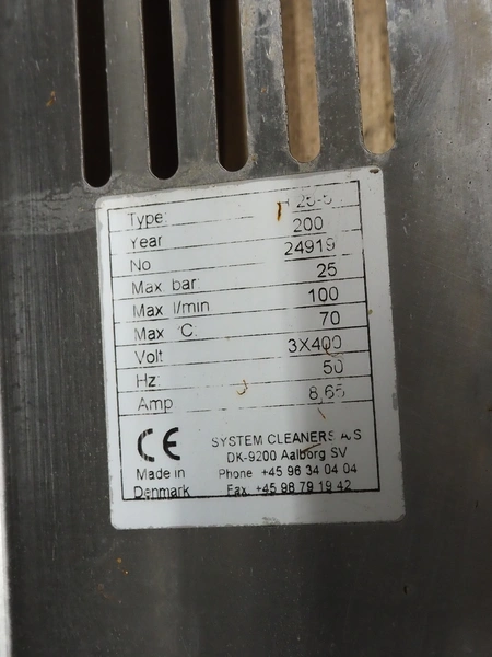 System Cleaners A/S foam mixing unit, type: H-25-5, number: 24919, 400 V, 3 Ph, 50 Hz, 8.65 A, maximum bar: 25, maximum liter per minute: 100, maximum temperature: 70°C, dimensions: 1600 mm x 650 mm x 500 mm.