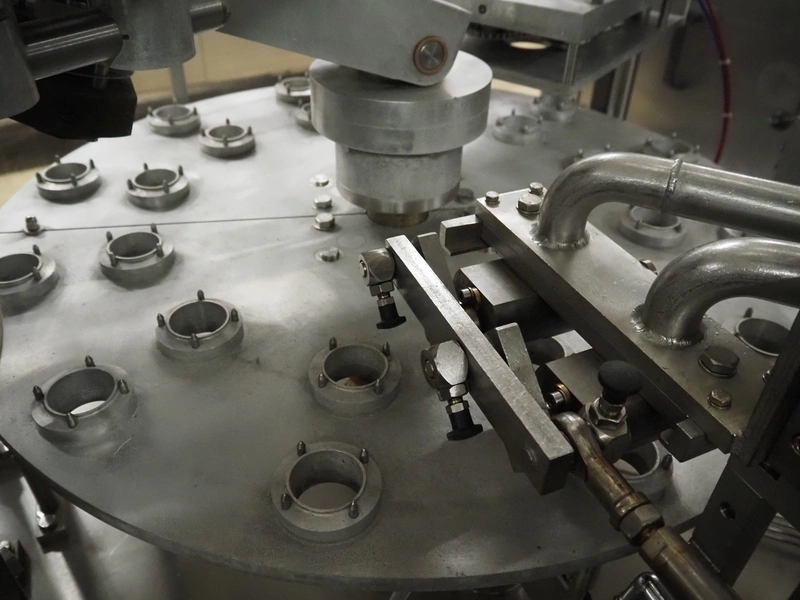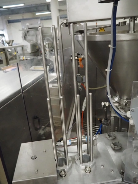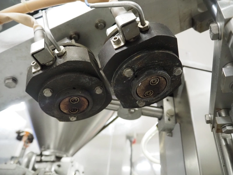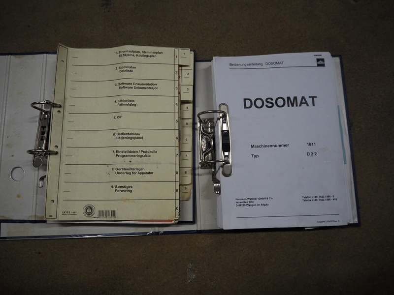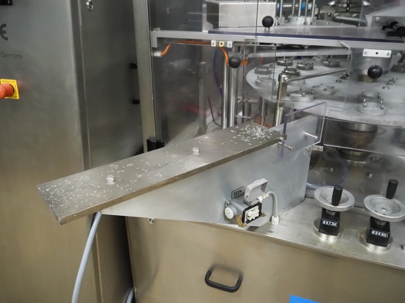 Waldner GmbH & Co. KG cup filling and sealing machine, type: DOSOMAT 2/2, machine number: 1811, year of construction: 1996, 3 x 220 VAC, 50 Hz, 10.0 A, 3800 Watt, diameter cups: (12 x 2) 50 mm, 4800 fillings per hour, weight: 1400 kg, plastic outfeed belt, belt width: 95 mm, total dimensions: 2900 mm x 2000 mm x 2200 mm.
