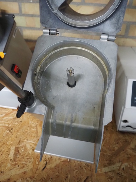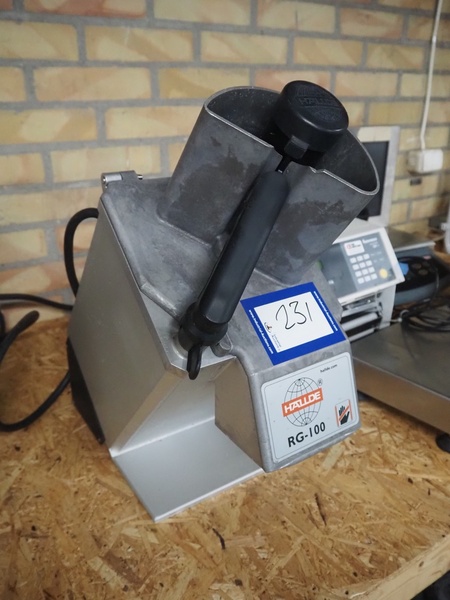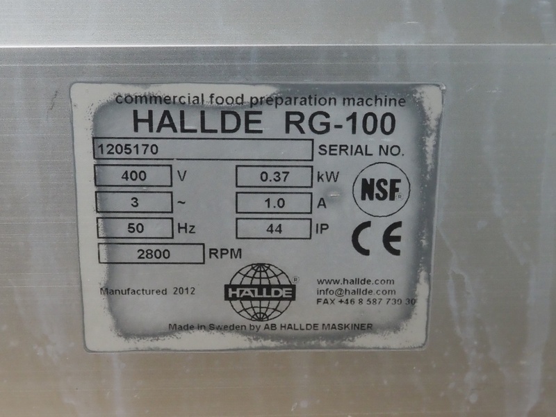 Hallde vegetable slicer, type: RG-100, serial number: 1205170, year of construction: 2012, 400 V, 3 Ph, 50 Hz, 1 A, 0.37 kW, dimensions: 500 mm x 250 mm x 480 mm.