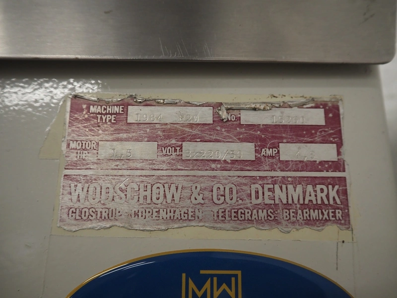 Wodschow & co mixer, type: R20, number: 15260, year of construction: 1984, 220 V, 3Ph, 50 Hz, 1.5 A, s/s bowl, dimensions bowl: ø 310 mm x 310 mm, total dimensions: 650 mm x 450 mm x 1450 mm.