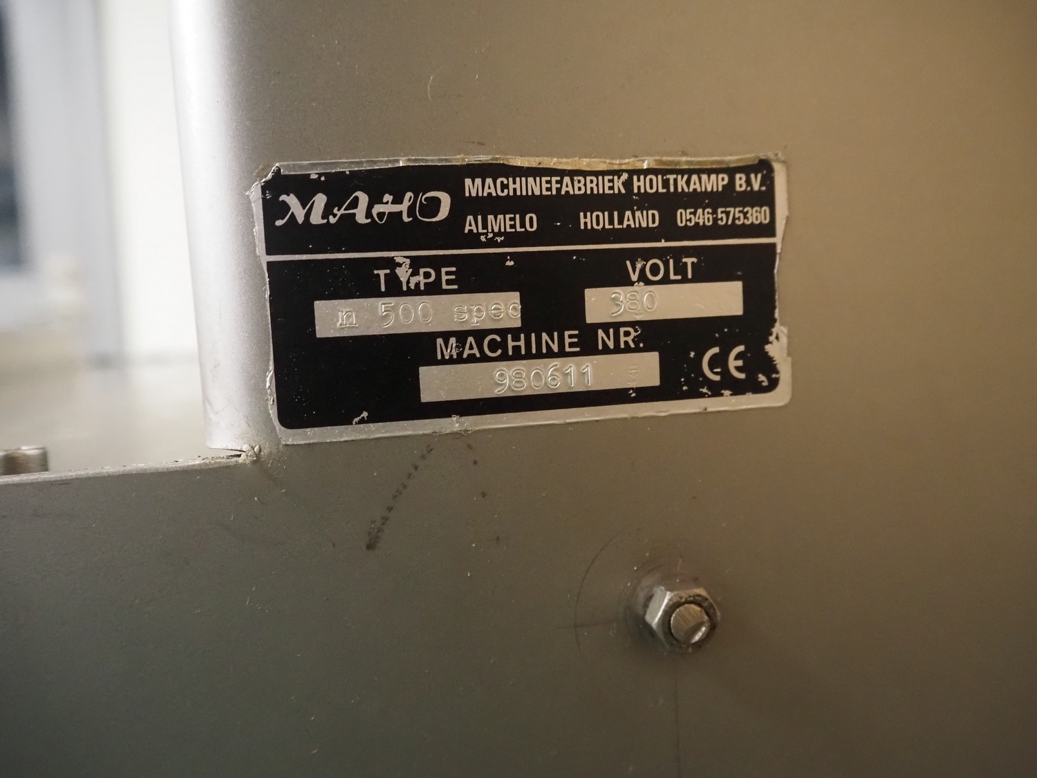 Maho Machinefabriek Holtkamp BV bread slicer, type: n 500 Spec, machine number: 980611, 380 V, 4 knives, distance between knives: 100 mm, working width: 510 mm, total dimensions: 750 mm x 700 mm x 1200 mm.