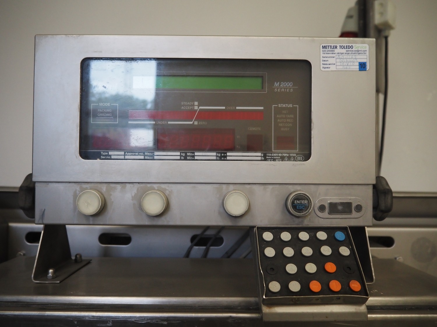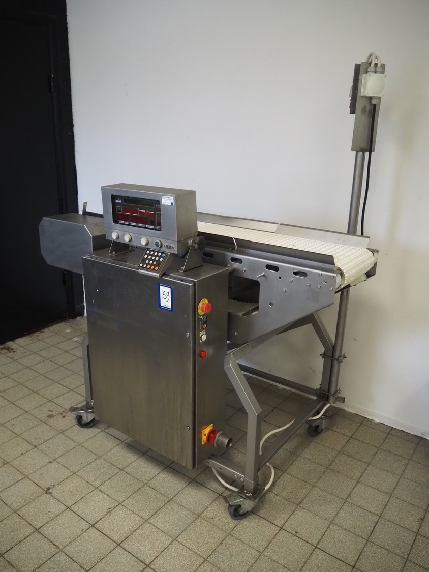 Marel checkweigher type: DWU 1460/300, serial number: A010895, year of construction: 2002, plastic mesh belt, belt width: 300 mm, total dimensions: 1450 mm x 950 mm x 1850 mm.