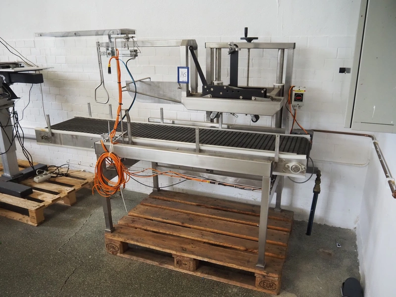 Box closing machine, plastic belt, belt width: 390 mm, total dimensions: 1950 mm x 800 mm x 1500 mm.