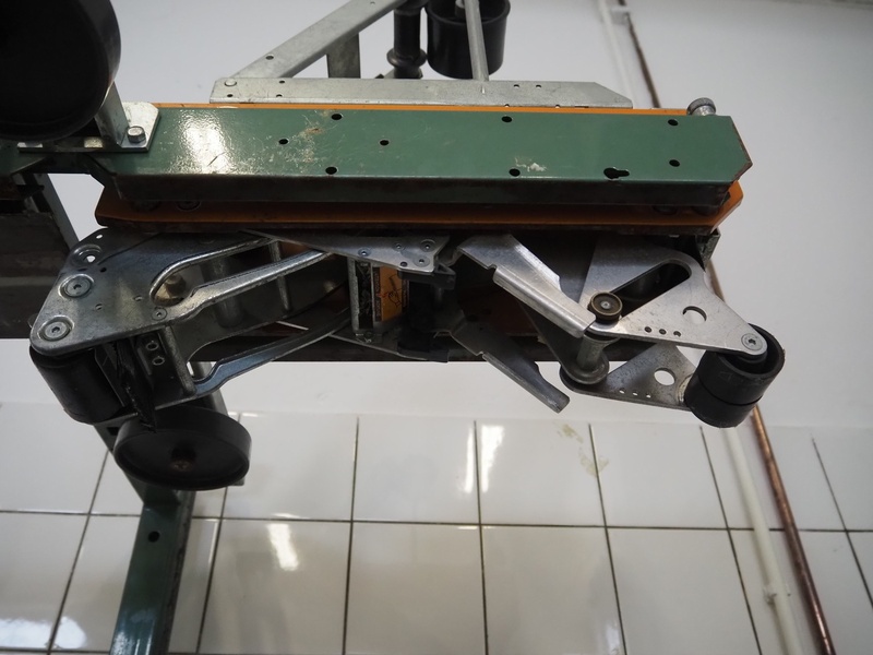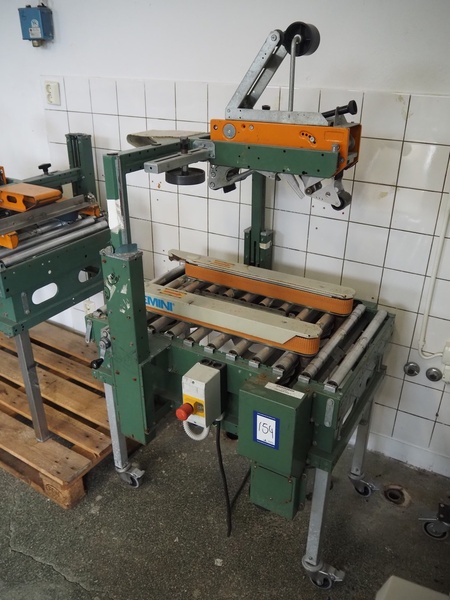 Comarme Marchetti F.A. spa box closing machine, with top taper, model: GEM-50, serial number: ZEO17440, year of construction: 1999, 380 V, 50 Hz, 0.8 A, 184 W, s/s rollers, maximum clearance: 400 mm x 400 mm, total dimensions: 900 mm x 900 mm x 1600 mm.