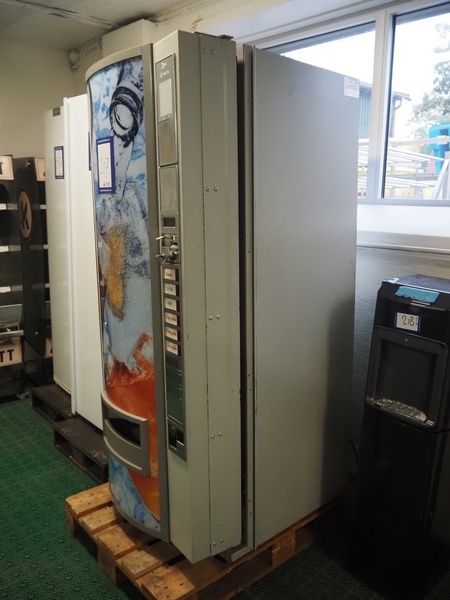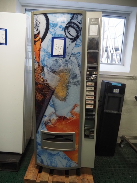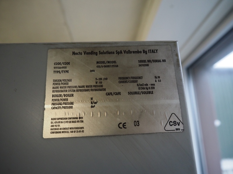 Necta Vending Solutions SpA soda vending machine, type: ZETA, model: 450/6-060 BSTI PSTON, serial number: 34702308, 230/240 V, 50 Hz, 5.5 A, 750 W, refrigeration: R134A / 0.320 kg, dimensions: 910 mm x 720 mm x 1830 mm.
