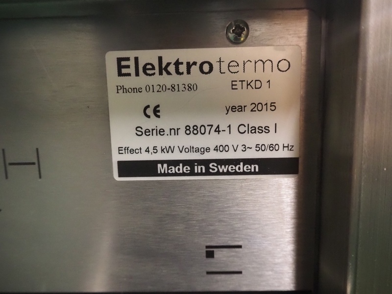 Elektro termo au bain marie, type : ETKD-1, serial number: 88074-1, year of construction: 2015, 400 V, 3 Ph, 50/60 Hz, 4.5 kW, inside dimensions: 510 mm x 310 mm x 210 mm, total dimensions: 650 mm x 400 mm x 880 mm.