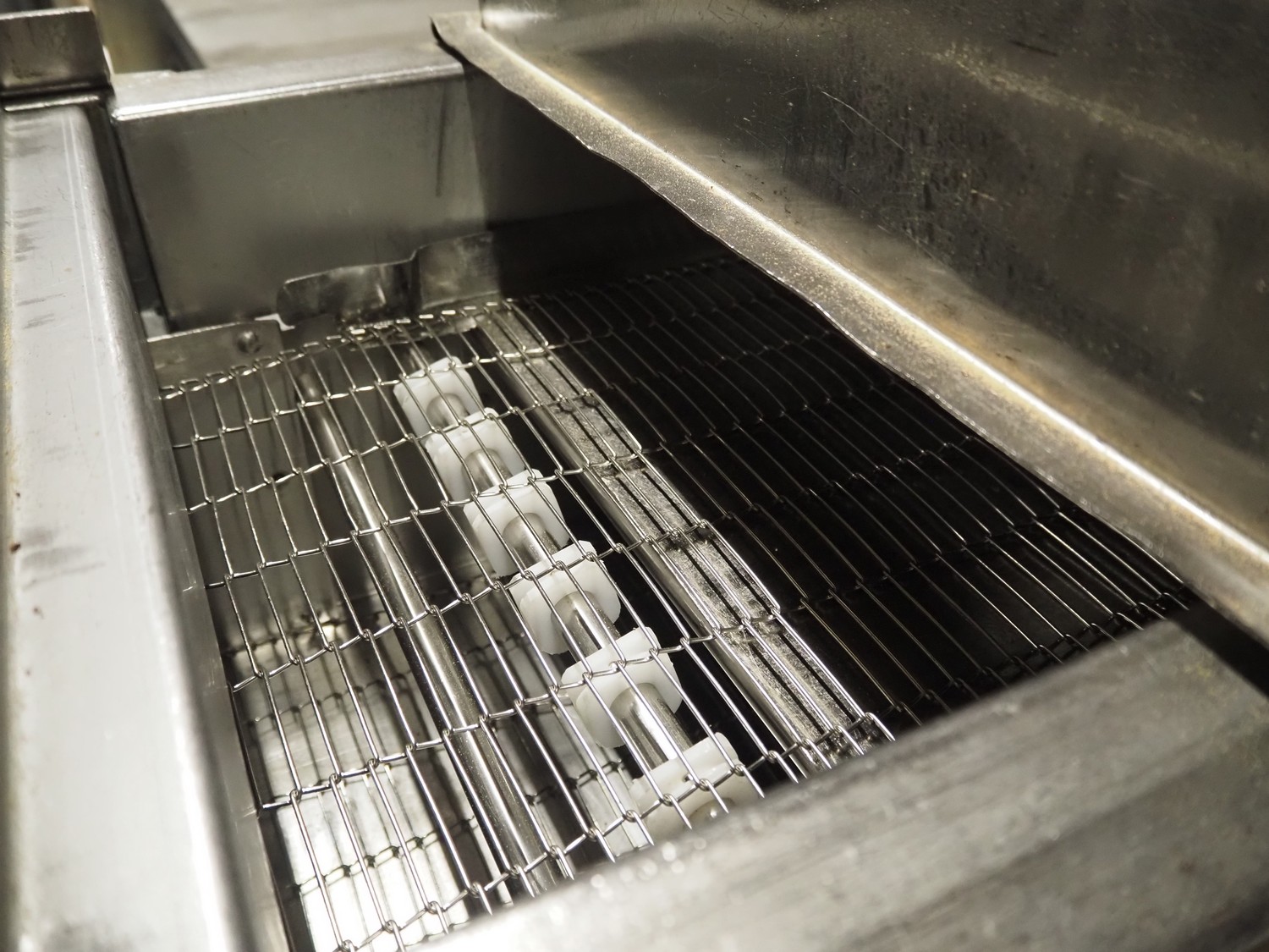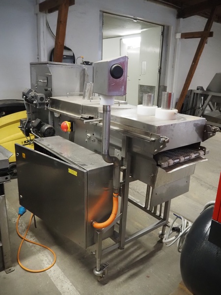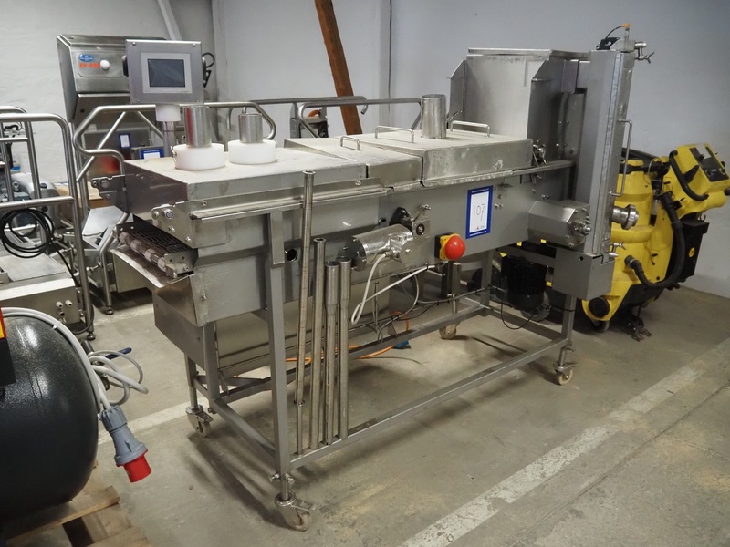S/s mobile breading machine, s/s mesh belt, belt width: 400 mm, clearance: 420 mm x 50 mm, total dimensions: 2200 mm x 1100 mm x 1700 mm.