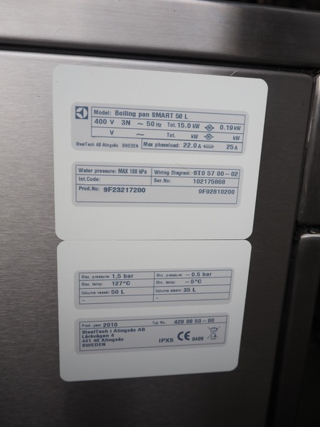 Electrolux double tiltable cooking vessel, model: Boiling pan SMART 50 L and Boiling pan SMART 150 L, serial number: 102175868 and 102175755, volume: 50 liter and 150 liter, dimensions: 2240 mm x 1020 mm x 1100 mm.