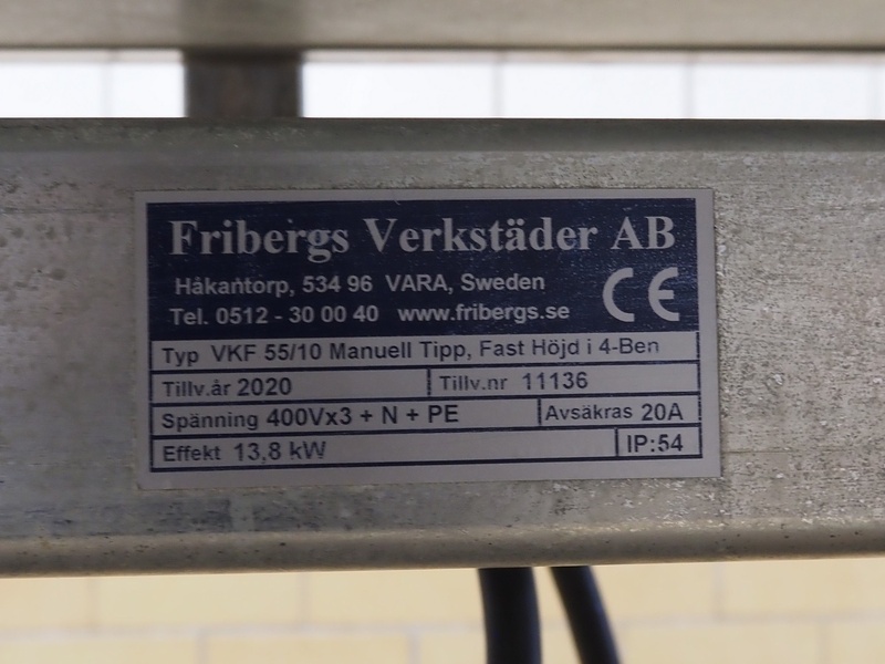 Fribergs Verkstäder AB cooking kettle, type: VKF 55/10, number: 11136, year of construction: 2020, 400 V, 3 Ph, 50 Hz, 20 A, 13.8 kW, inside dimensions: 650 mm x 100 mm x 100 mm, total dimensions: 1200 mm x 850 mm x 1000 mm.