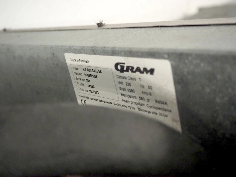 Gram refrigerator, type: KP 660 CXH 5S, serial number: 363, 230 V, 50 Hz, 6A, 1380 kW, refrigerant: R404a / 380 gram, inside dimensions: 690 mm x 500 mm x 1760 mm, total dimensions: 810 mm x 750 mm x 2160 mm.