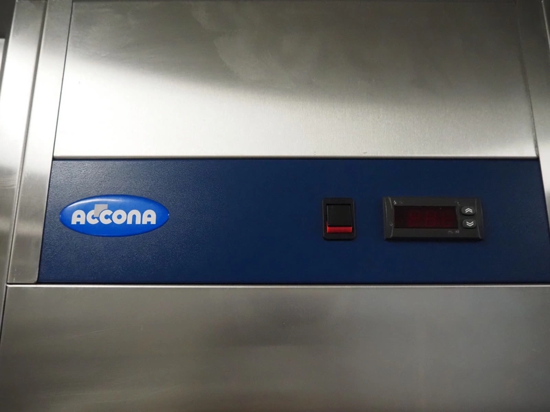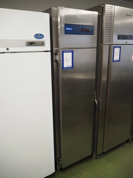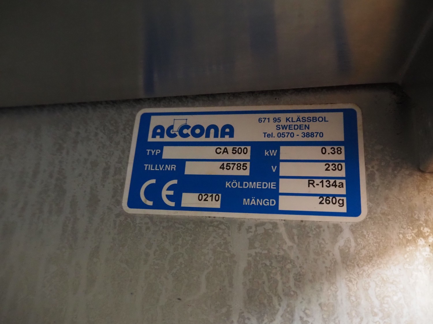Accona refrigerator, type: CA 500, number: 45785, 230 V, 0.38 kW, refrigerant: R-134a, 260 g, 3 floors, floor dimensions: 520 mm x 450 mm, total dimensions: 620 mm x 730 mm x 2100 mm.