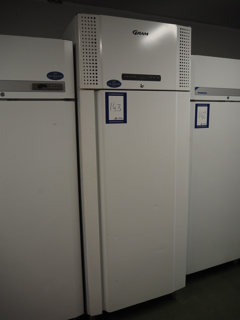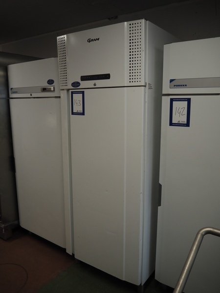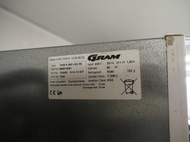 Gram refrigerator, type: Twin K 660 LSG 5N, serial number: 037, 230 V, 50 Hz, 1.01 A, 211 Watt, refrigerant: R404A, 5 floors, floor dimensions: 650 mm x 530 mm, total dimensions: 800 mm x 760 mm x 2160 mm.