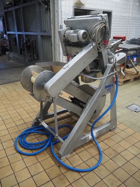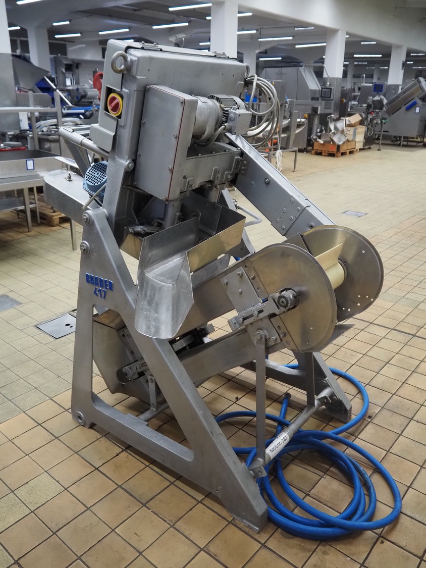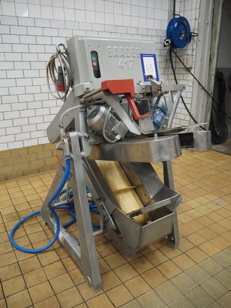 Baader V-cut deheader, type: 417, knife diameter: (2x) 200 mm, plastic belt, belt width: 280 mm, divider height: 70 mm, distance between dividers: 900 mm, elevating height: 1200 mm, total dimensions: 1700 mm x 1100 mm x 1900 mm.