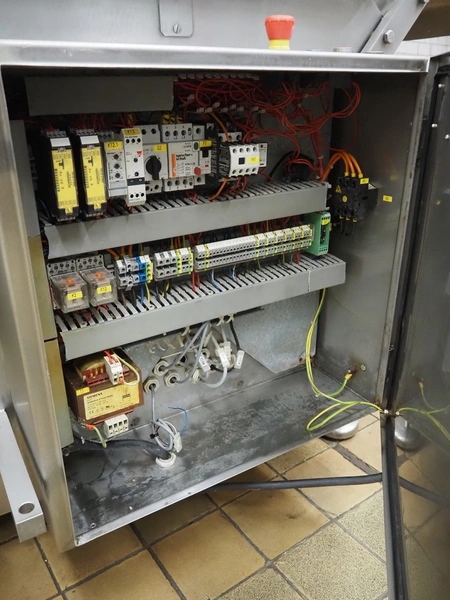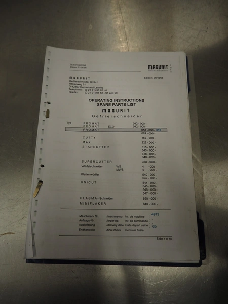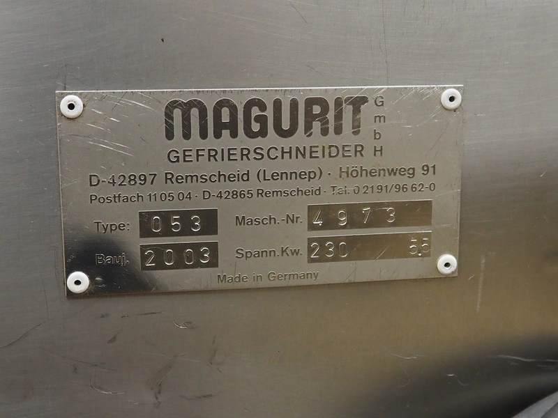 Magurit frozen block cutter, type: 053, machine number: 4973, year of construction: 2003, 230 V, 5.5 kW, maximum block size: 500 mm x 600 mm x 240 mm, total dimensions: 1850 mm x 1100 mm x 1750 mm.