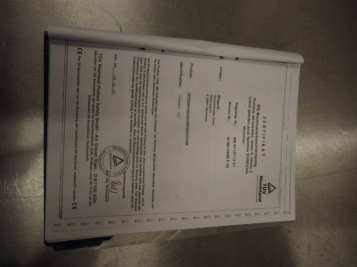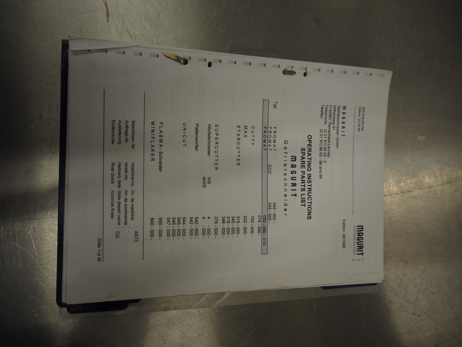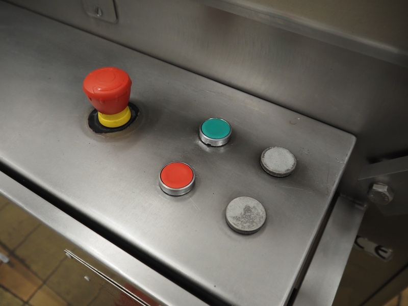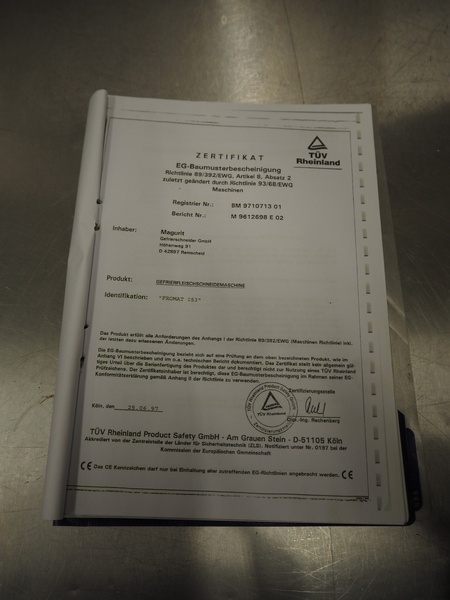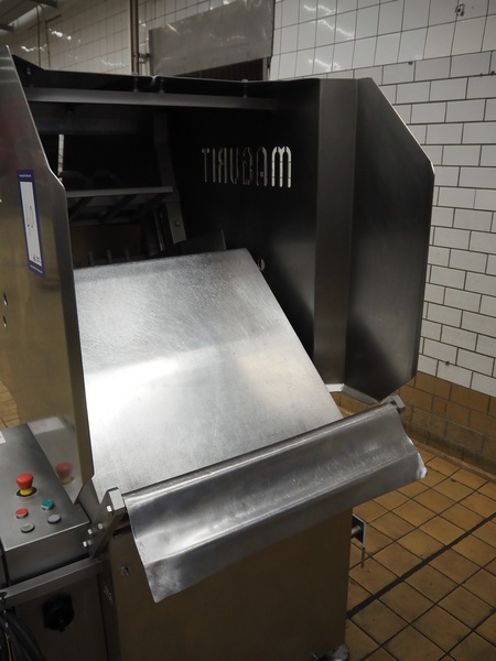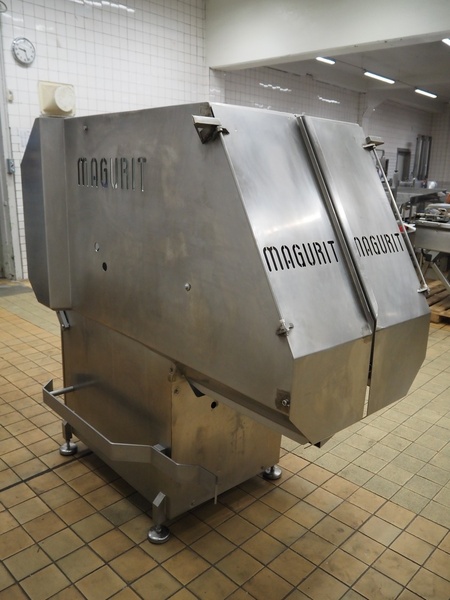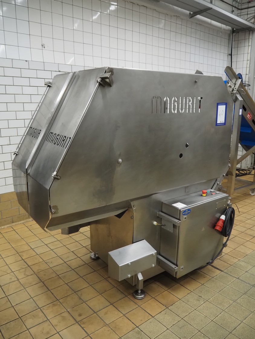 Magurit frozen block cutter, type: 053, machine number: 4973, year of construction: 2003, 230 V, 5.5 kW, maximum block size: 500 mm x 600 mm x 240 mm, total dimensions: 1850 mm x 1100 mm x 1750 mm.