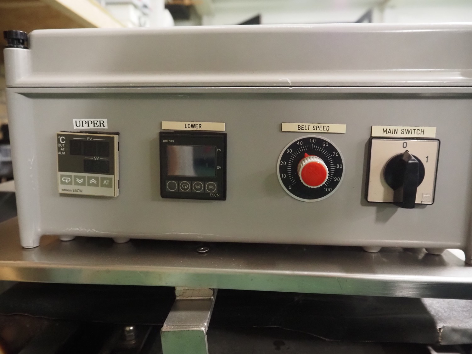 Teflon belt grill, upper belt width : 185 mm, lower belt width: 220 mm, total dimensions: 950 mm x 400 mm x 540 mm.