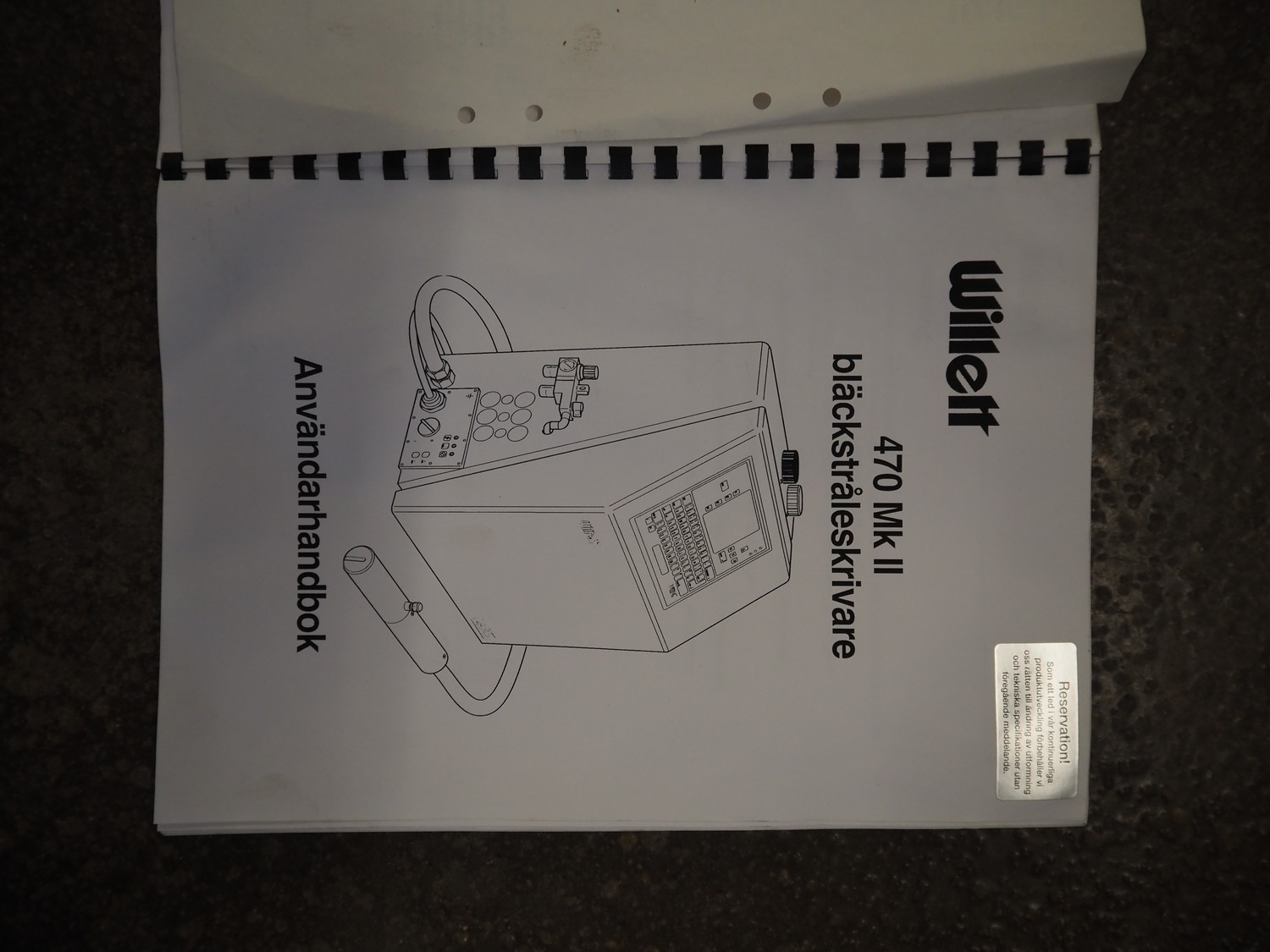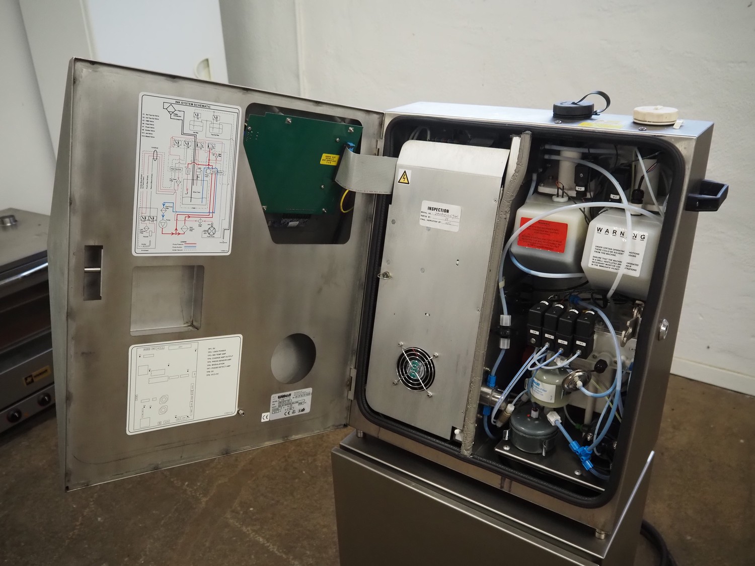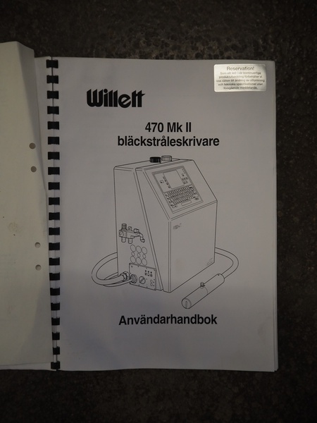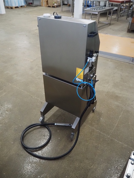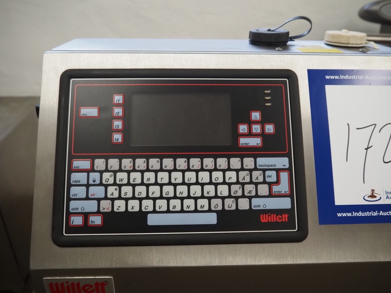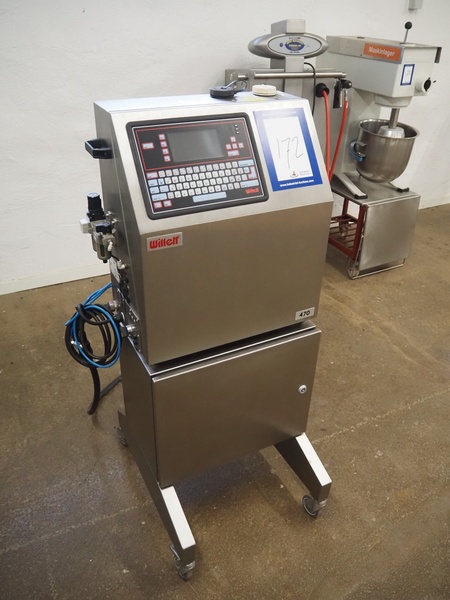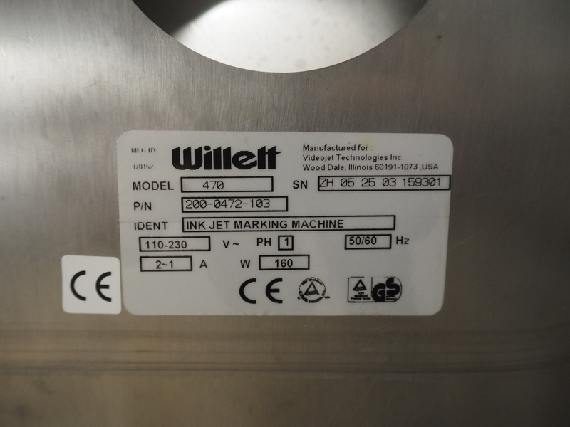 Willet inkjet printer on mobile s/s cabinet, model: 470, serial number: ZH 05 25 03 159301, product number: 200-0472-103, 110-230 V, 1Ph, 50-60 Hz, 160 W, dimensions: 650 mm x 570 mm x 1240 mm.