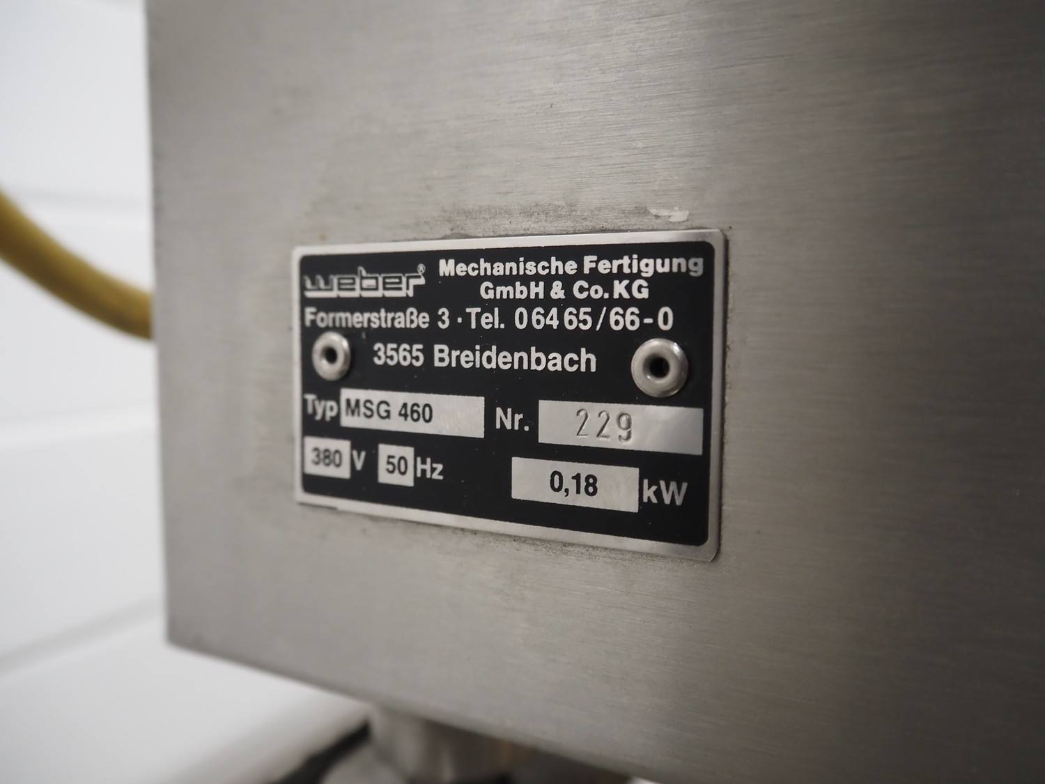 Weber knife sharpener, type: MSG 460, number: 229, 380 V, 50 Hz, 0.18 kW, dimensions: 560 mm x 600 mm x 1700 mm.