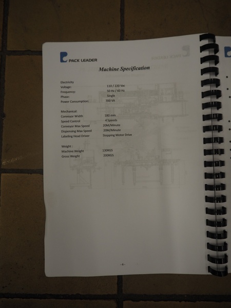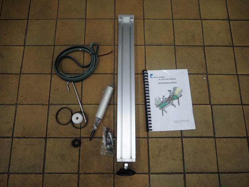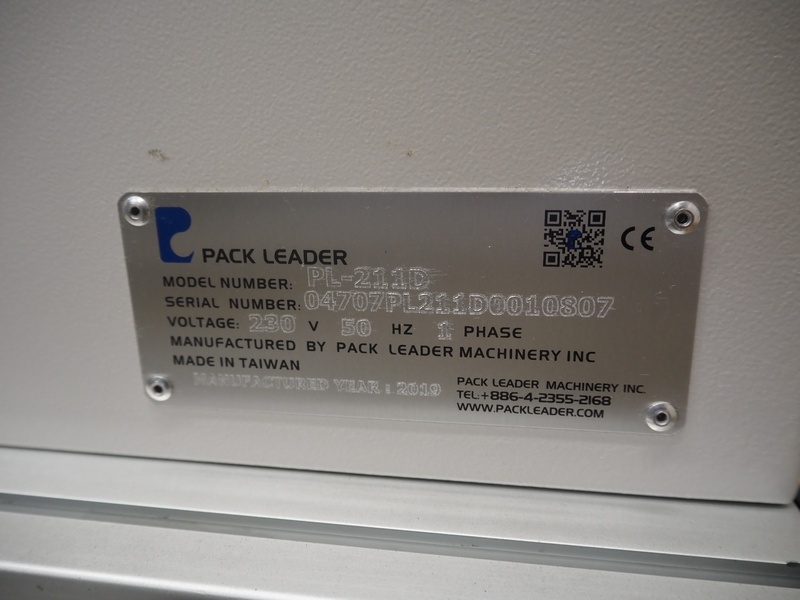 Pack leader labeller, model: PL-211D, serial number: 04707PL211D0010807, year of construction: 2019, 230 V, 1 Ph, 50 Hz, plastic belt, belt width: 360 mm, label width: 90 mm, total dimensions: 2600 mm x 1170 mm x 1650 mm.