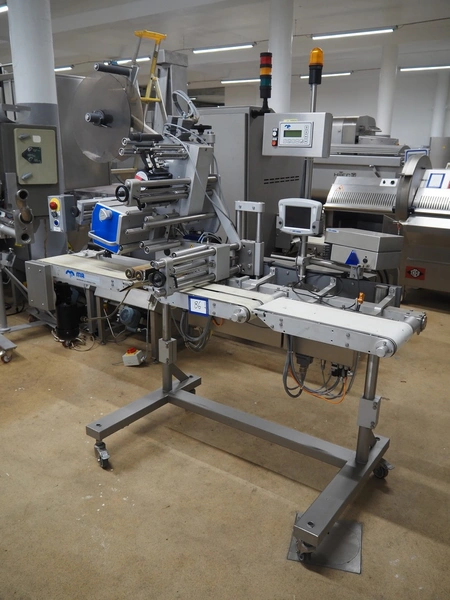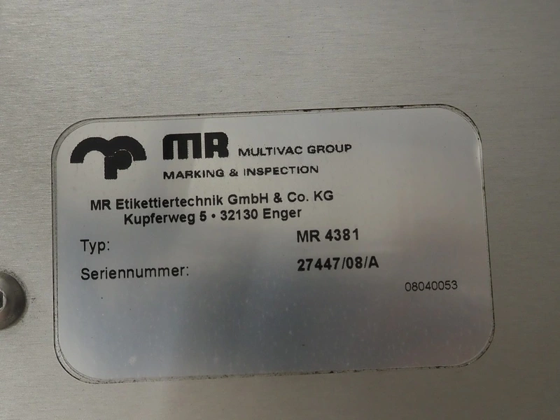 MR Etikettiertechnik GmbH & Co. KG. mobile labelling machine, type: MR 4333, serial number: 27447/08/A, 230 V, 50 Hz, 2500 VA, plastic belt, belt width: 190 mm, (2x) 85 mm, total dimensions: 1900 mm x 850 mm x 1900 mm.