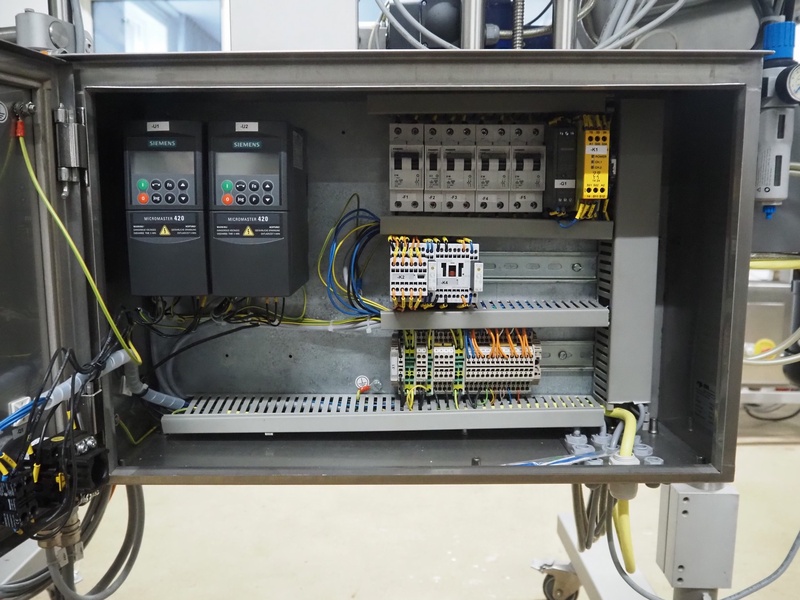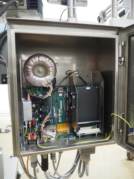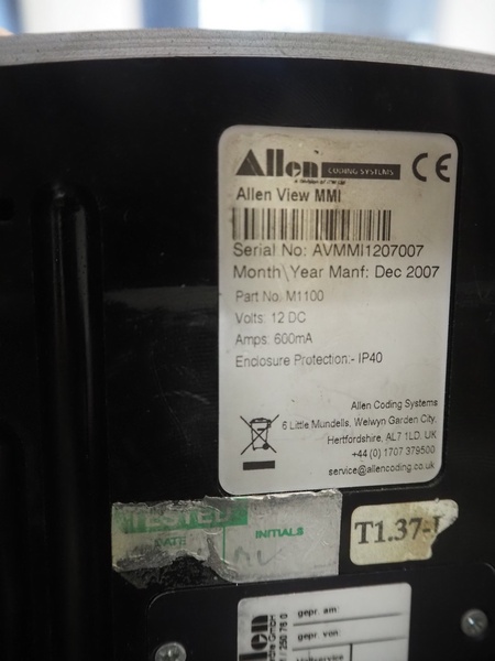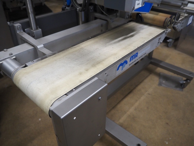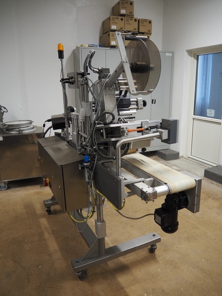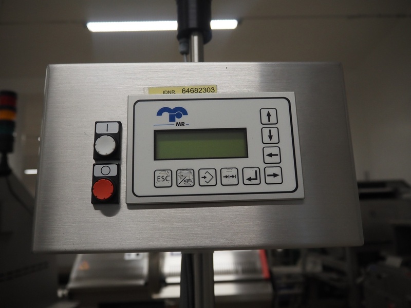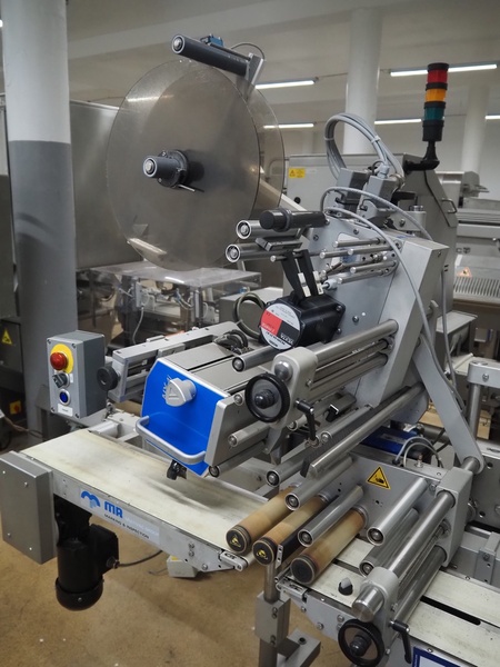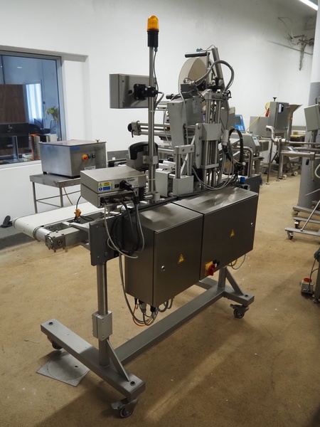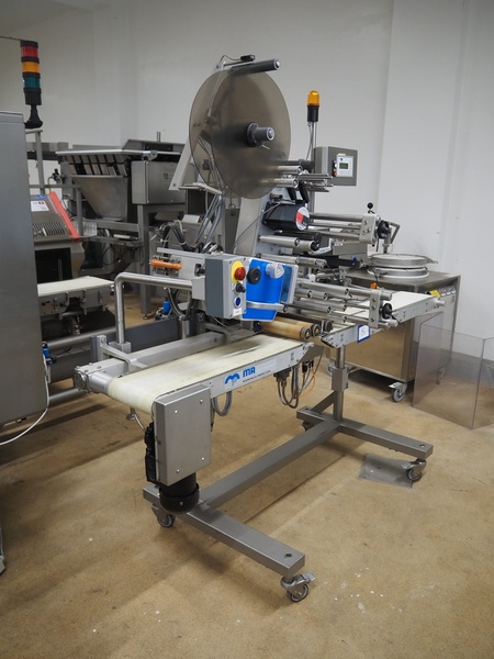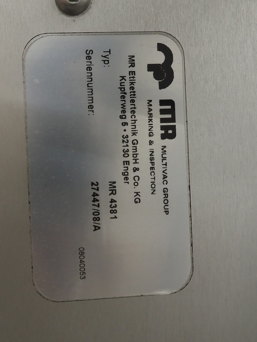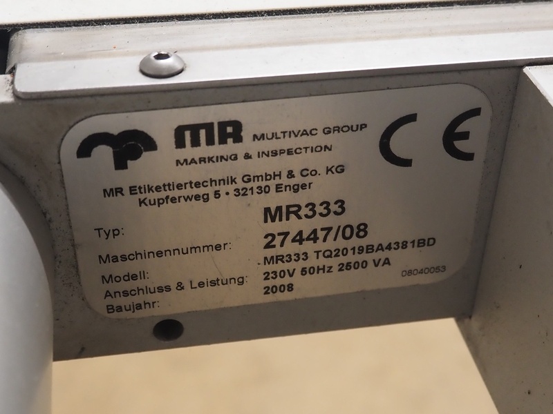 MR Etikettiertechnik GmbH & Co. KG. mobile labelling machine, type: MR 4333, serial number: 27447/08/A, 230 V, 50 Hz, 2500 VA, plastic belt, belt width: 190 mm, (2x) 85 mm, total dimensions: 1900 mm x 850 mm x 1900 mm.