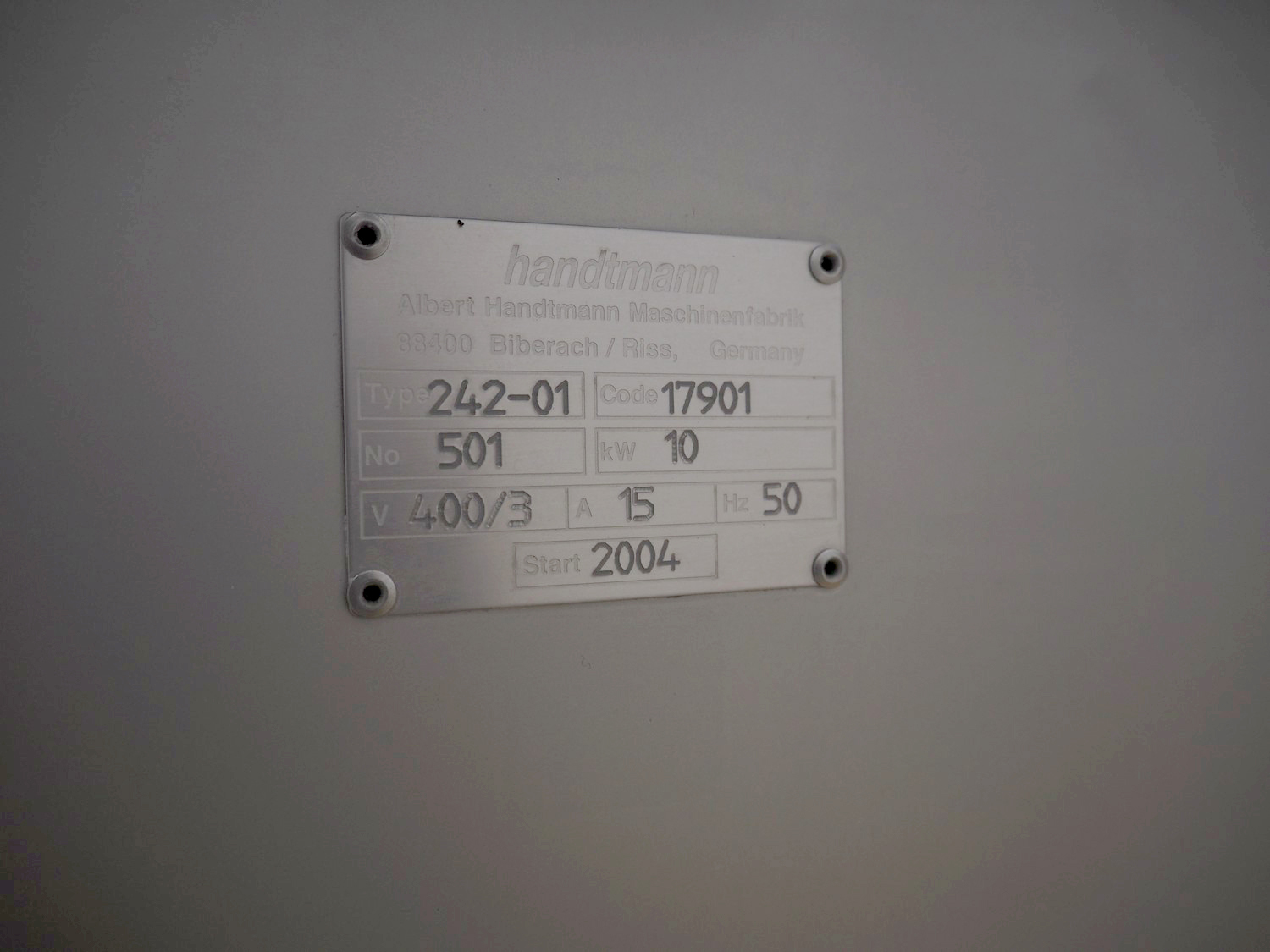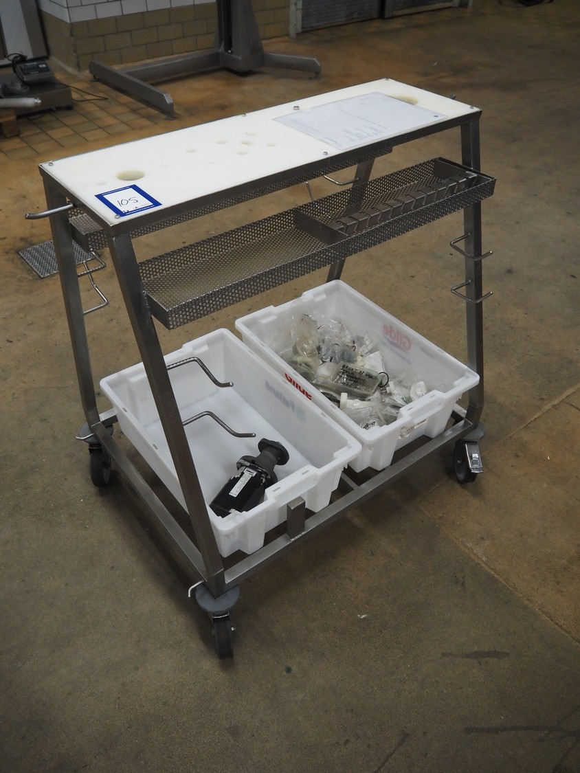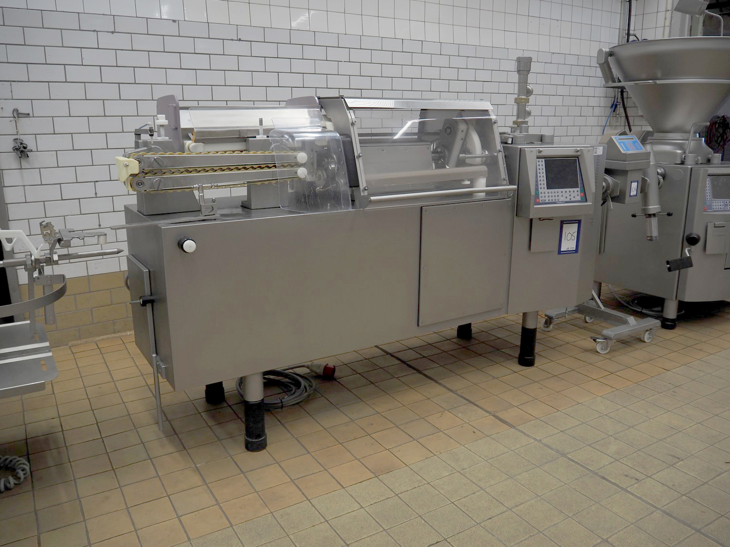 Handtmann mobile portioning and linking machine, type: 242-01, number: 501, year of construction: 2004, 400 V, 3 Ph, 50 Hz, 15 A, 10 kW, dimensions: 2600 mm x 880 mm x 1780 mm.