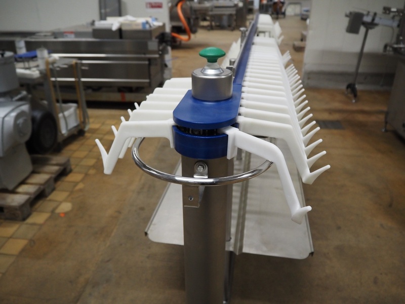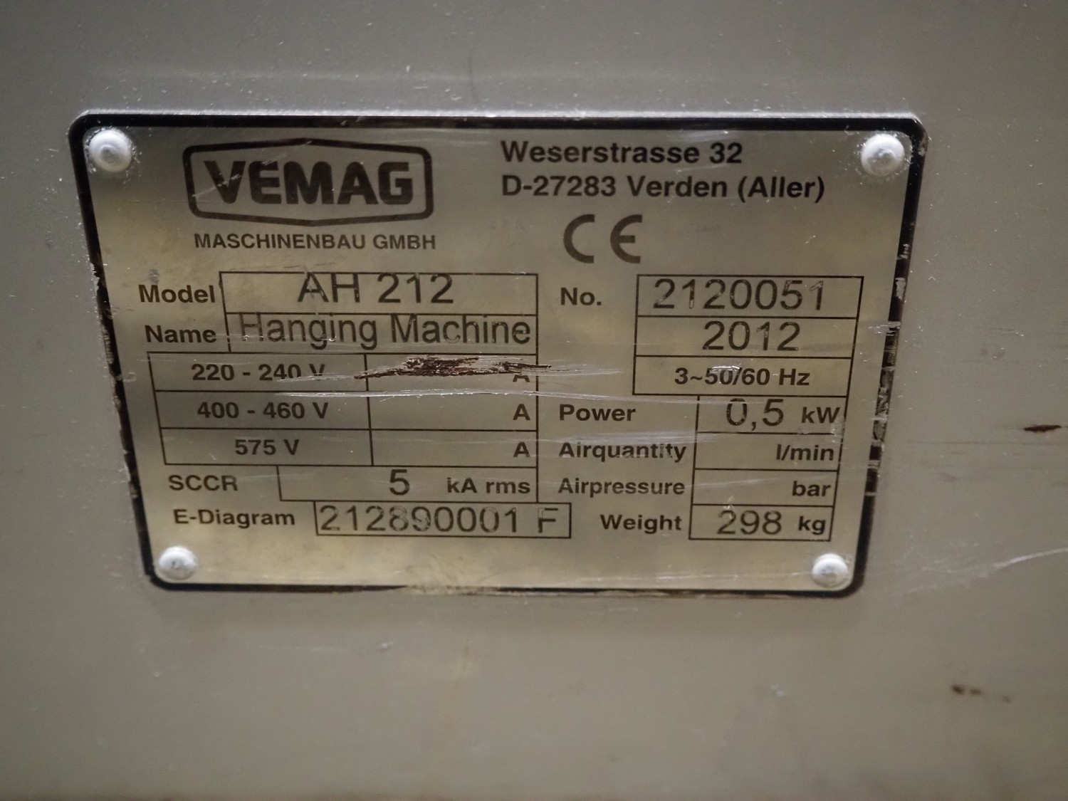 Vemag mobile hanging line, model: AH 212, number: 2120051, year of construction: 2012, 220-240, 3 Ph, 50/60 Hz, 0.5 kW, weight: 298 kg, dimensions: 4300 mm x 1000 mm x 1400 mm.