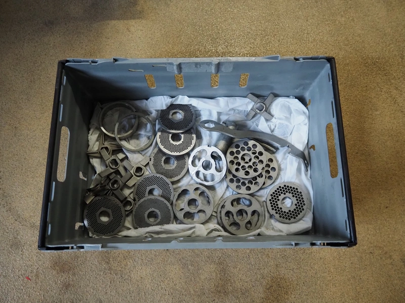Koneteollisuus OY mobile mixer-grinder, plate diameter: 98 mm, total dimensions: 1070 mm x 720 mm x 1300 mm. Including large amount of extra knives and plates.