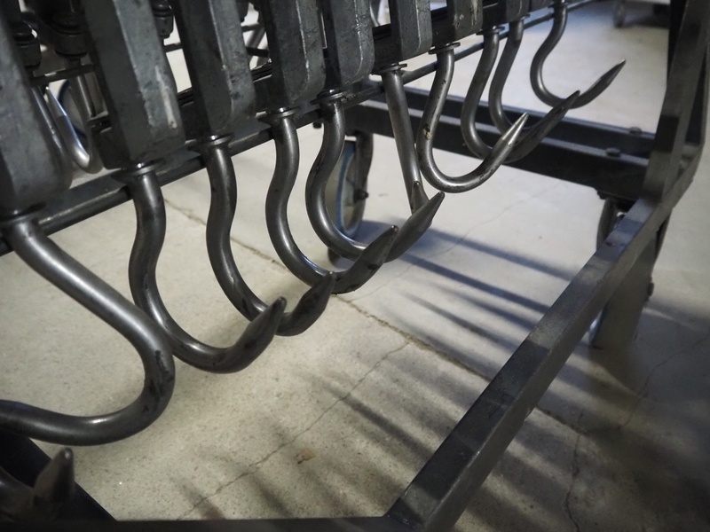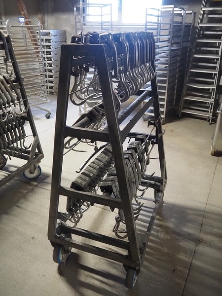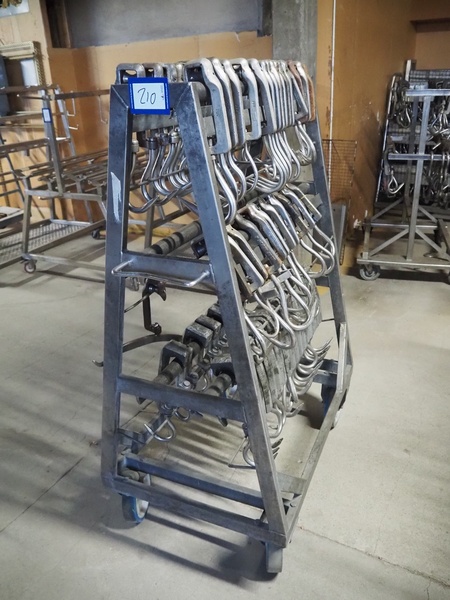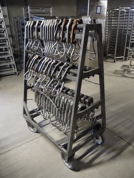 S/s trolley with large amount of meat hooks, dimensions trolley: 1060 mm x 650 mm x 1530 mm.