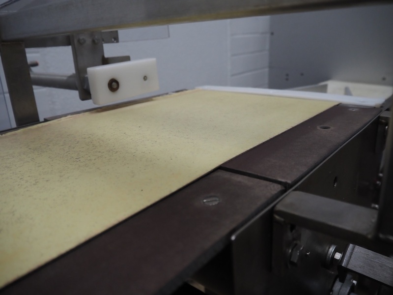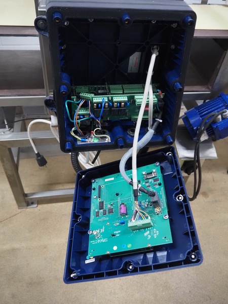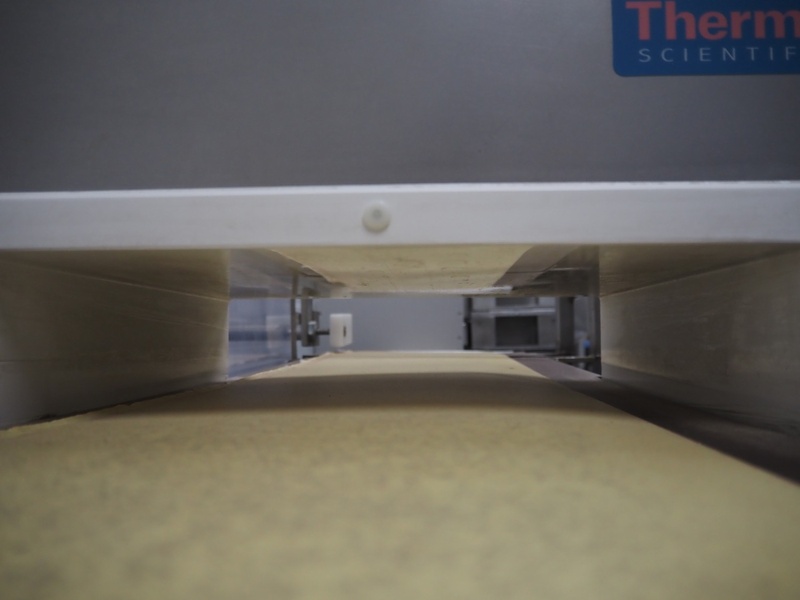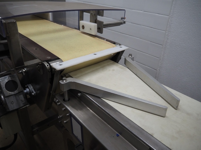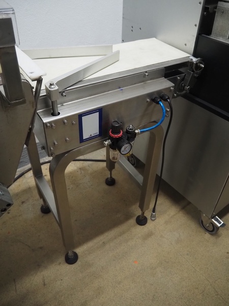 Thermo Scientific metal detector with rejector, serial number: 19070682G, 120/230 V, 50/60 Hz, 0.40 A, plastic belt, belt width: 270 mm, clearance: 350 mm x 75 mm, total dimensions: 1550 mm x 1100 mm x 1100 mm.