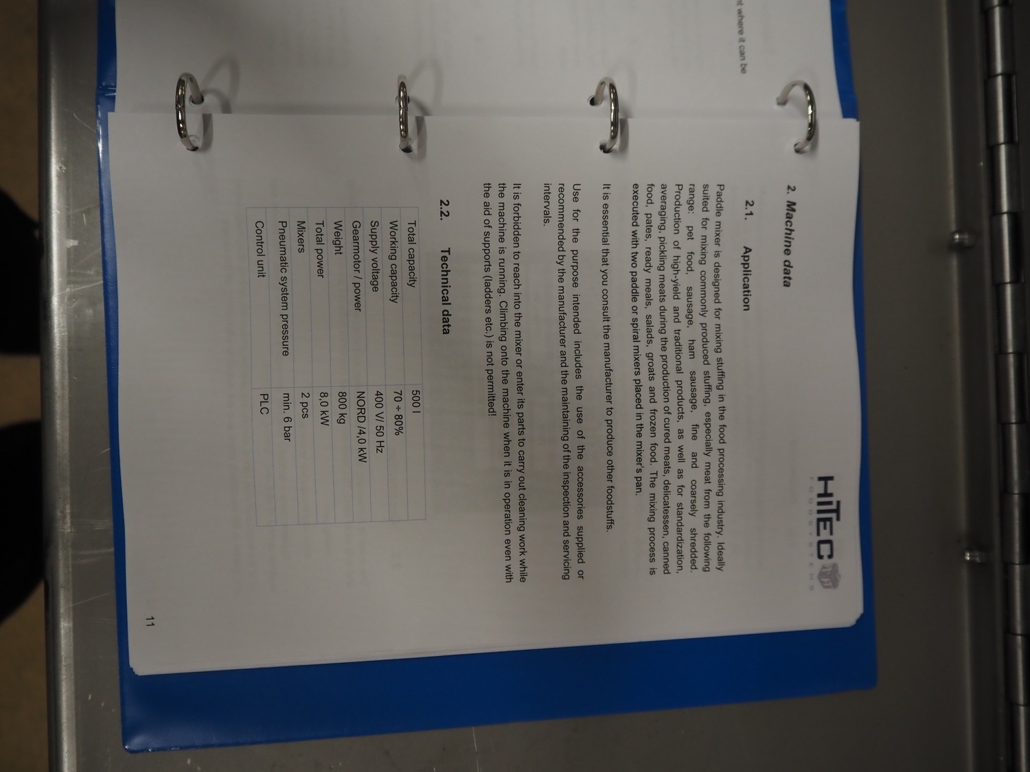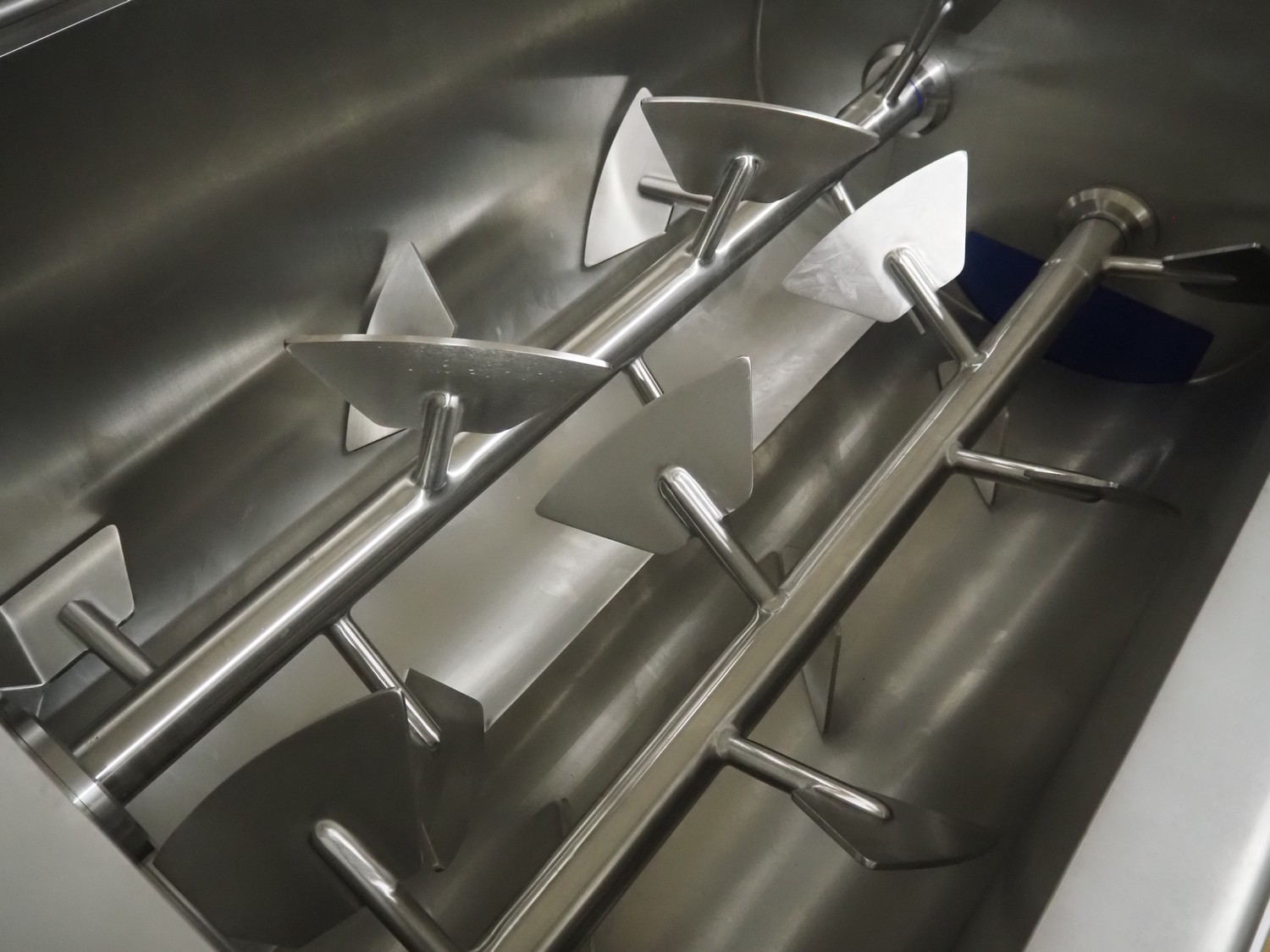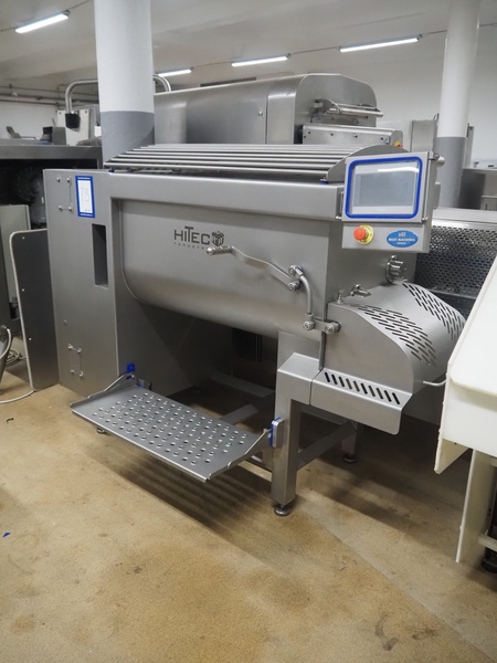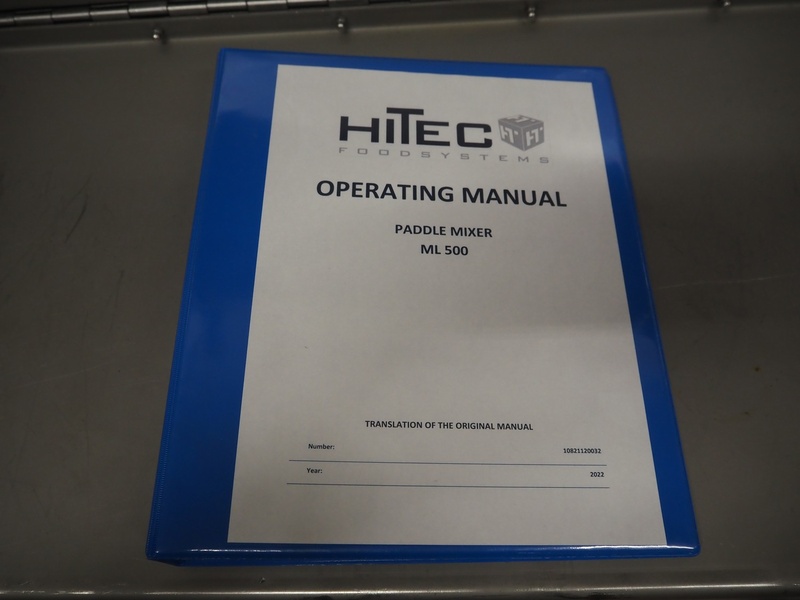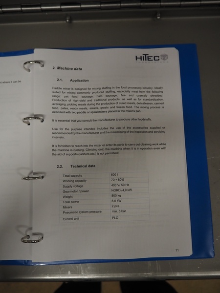 Ekomex / Hitec Foodsystems double shaft paddle mixer, type: ML 500, machine number: 10821120032, year of construction: 2022, 400 V, 3 Ph, 50 Hz, 8 kW, machine weight: 800 kg, volume: 500 liter, dimensions: 2180 mm x 1070 mm x 1550 mm.