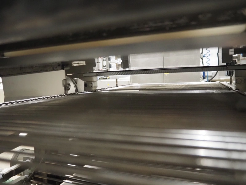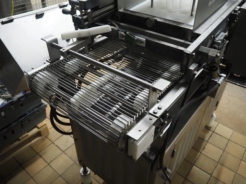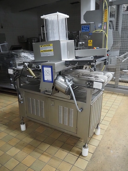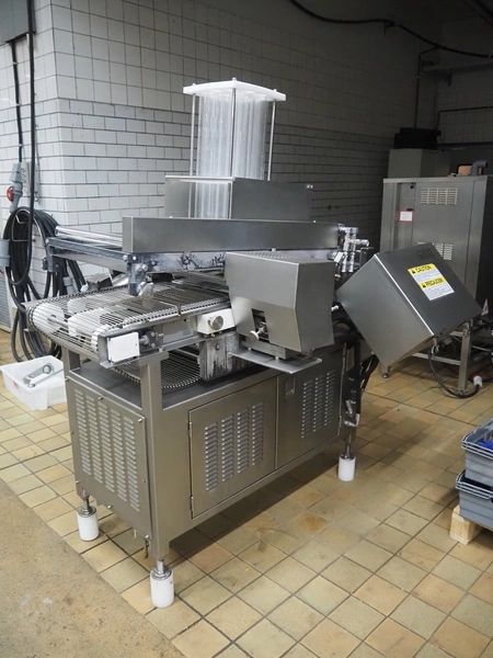 Grote pepperoni slicer, model: FG101-2001, serial number: 1087319, s/s mesh belt, belt width: 460 mm, knife width: 470 mm, diameter pipes: (10x) 50 mm, total dimensions: 1570 mm x 1230 mm x 1840 mm. Including parts.