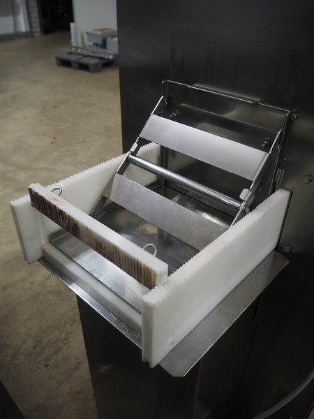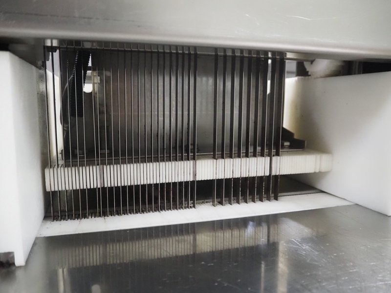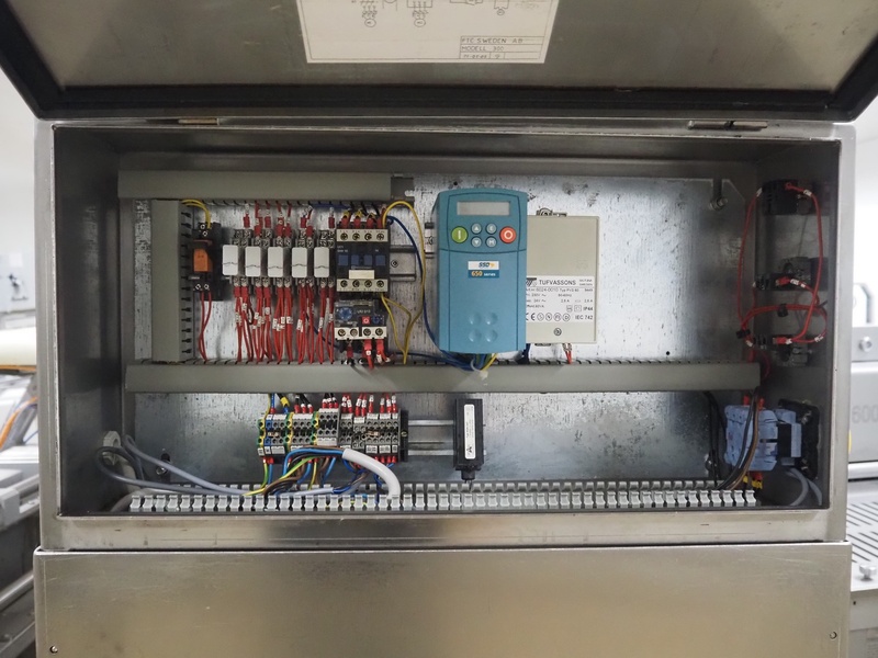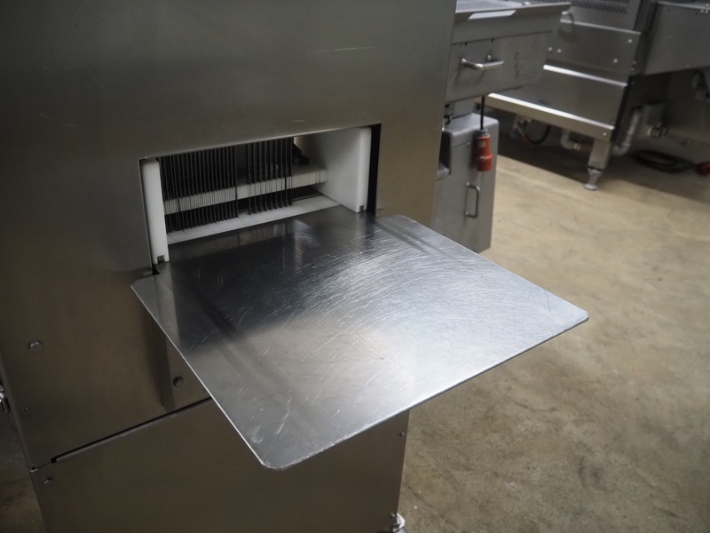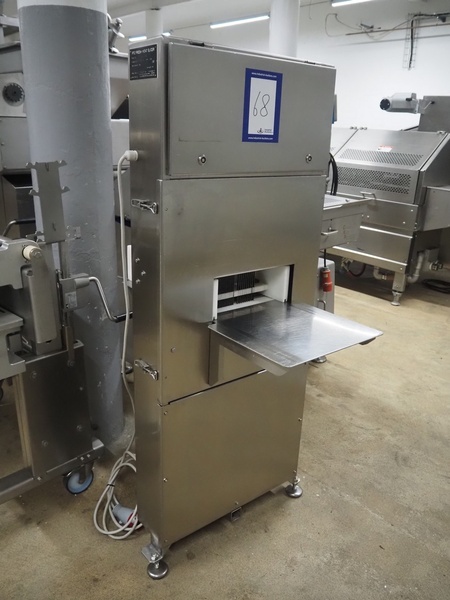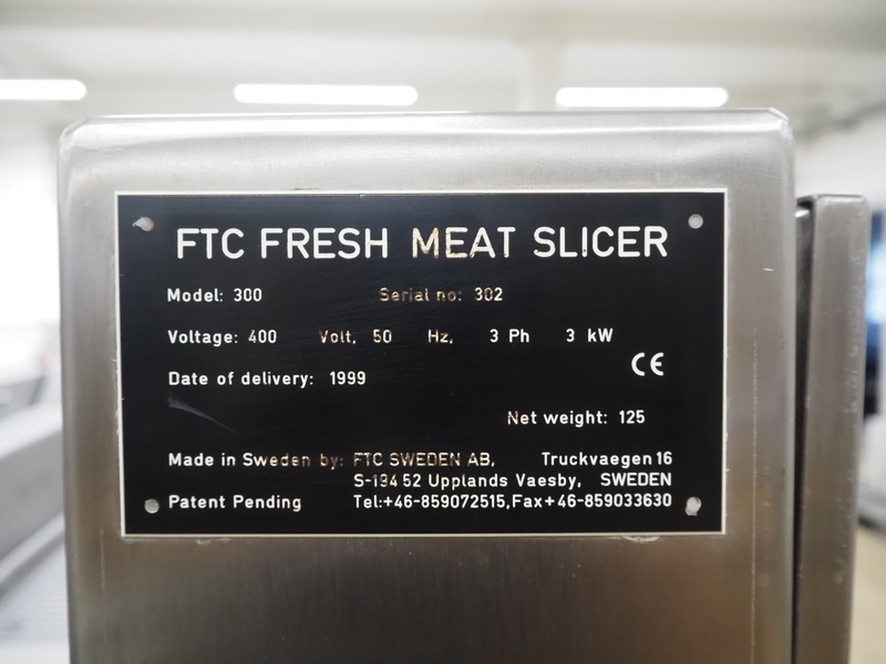 FTC Sweden AB fresh meat slicer, model: 300, serial number: 302, year of construction: 1999, 400 V, 3 Ph, 50 Hz, 3 kW, clearance: 300 mm x 140 mm, distance between knives: 5 mm, total dimensions: 750 mm x 930 mm x 1700 mm.