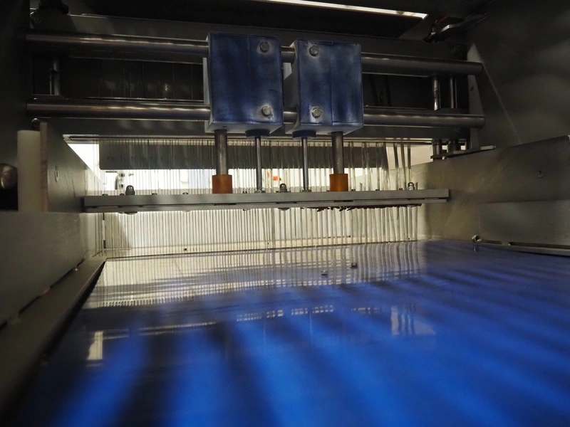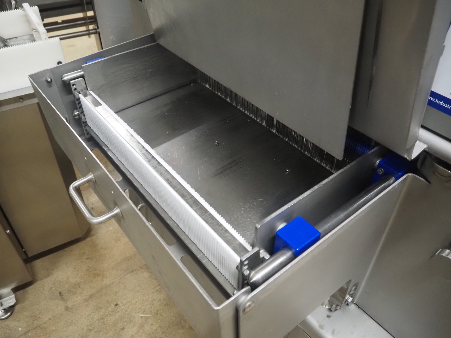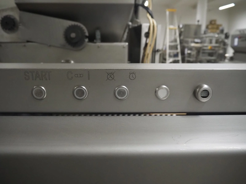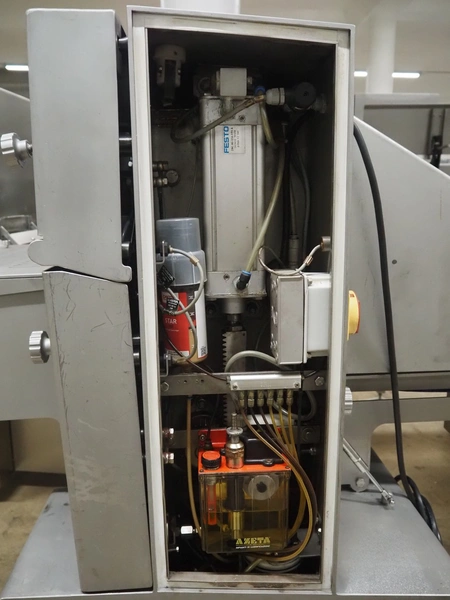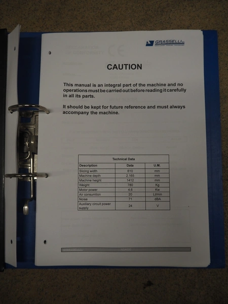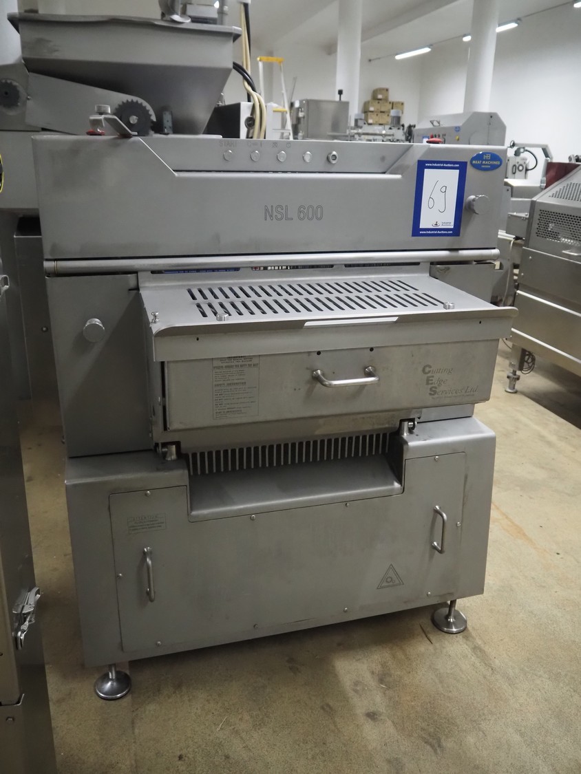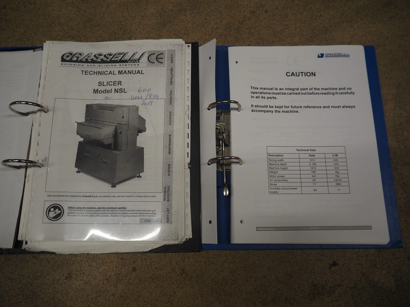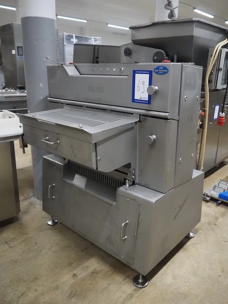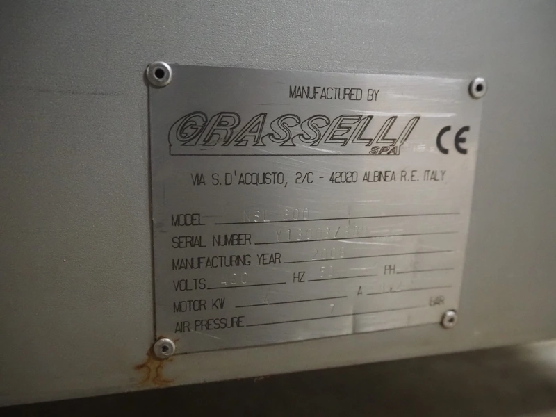 Grasselli SpA slicer, model: NSL 600, serial number: Y13003/839, year of construction: 2008, 400 V, 3 Ph, 50 Hz, 4 kW, working width: 610 mm, distance between knives: 20 mm, plastic belt, belt width: 540 mm, total dimensions: 1500 mm x 1200 mm x 1500 mm.