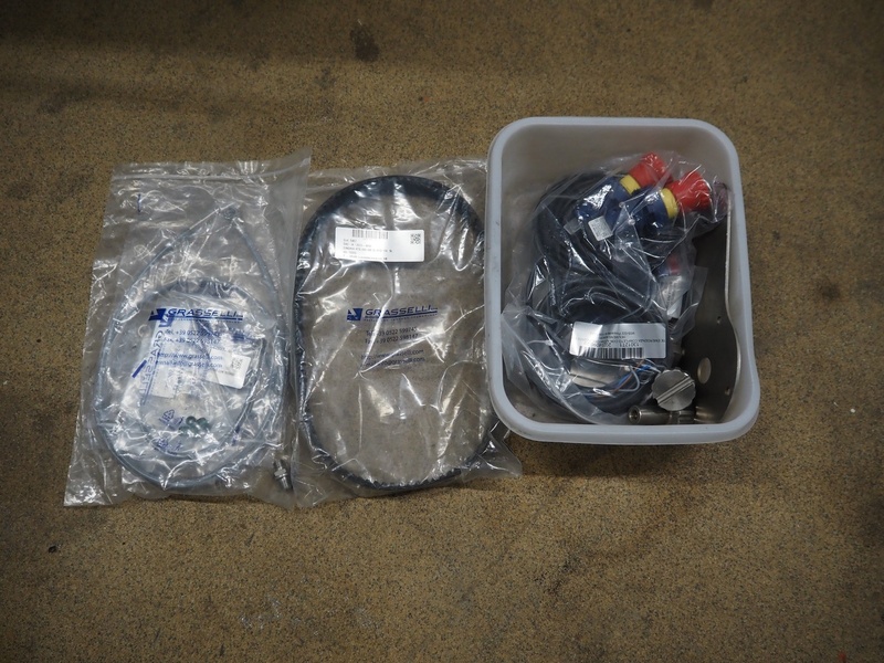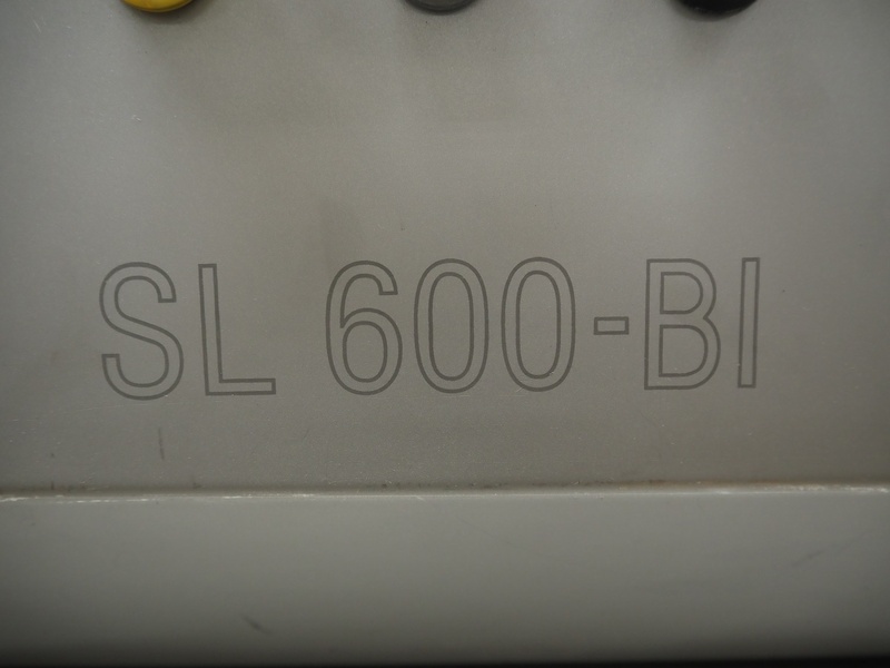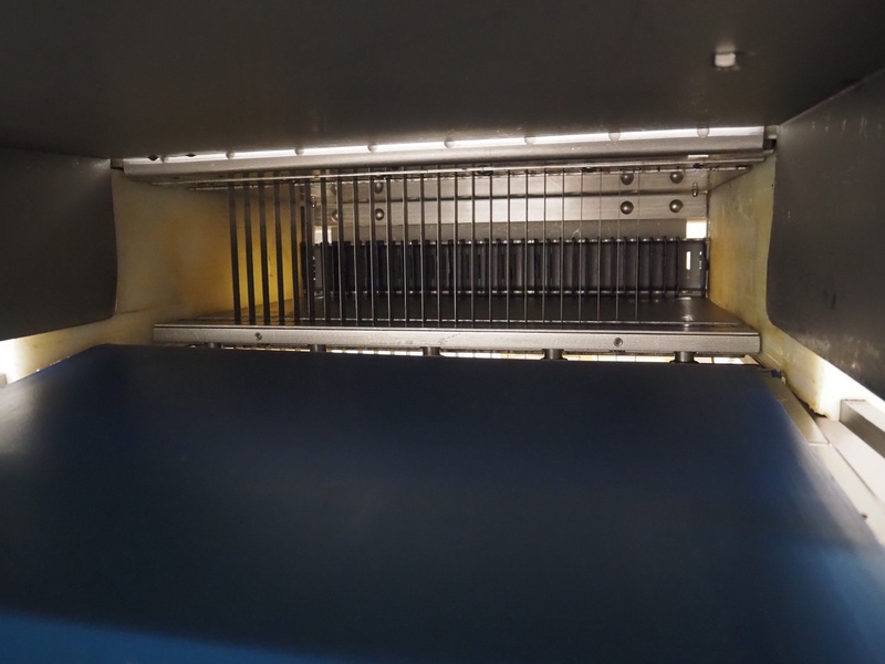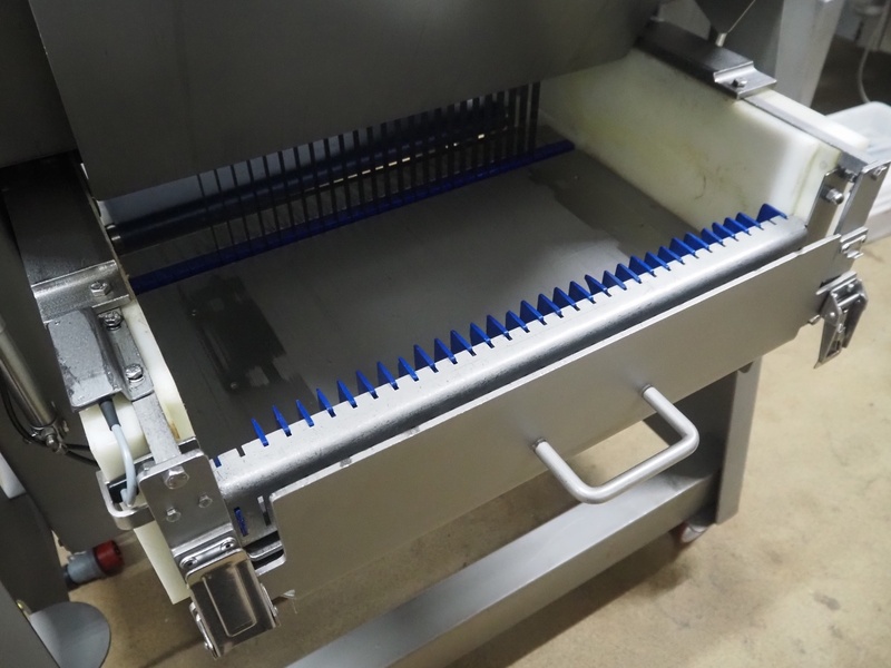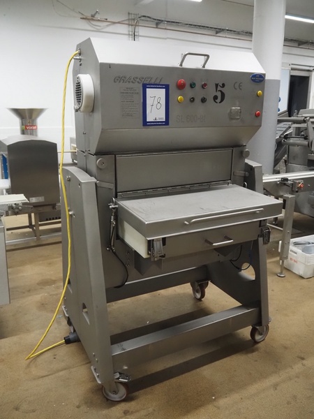 Grasselli SpA mobile automatic slicer, model: SL600-BI, plastic belt, belt width: 570 mm, 25 knives, distance between knives: 18 mm, total dimensions: 1370 mm x 1160 mm x 1870 mm.