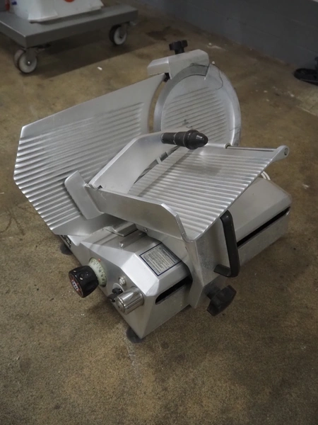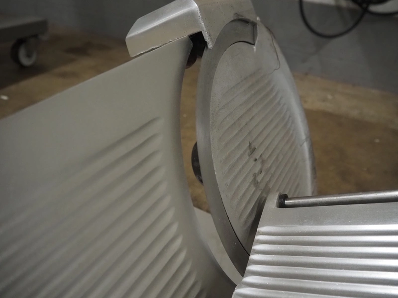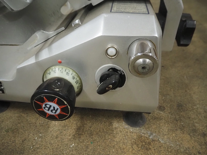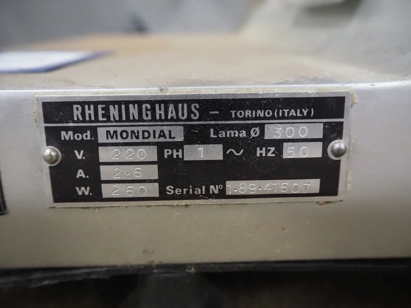 Rheninghaus slicer, model: Mondial, serial number: 1.89.41607, 220 V, 1 Ph, 50 Hz, 2.6 A, 260 W, diameter knife: 300 mm, dimensions: 570 mm x 500 mm x 400 mm.