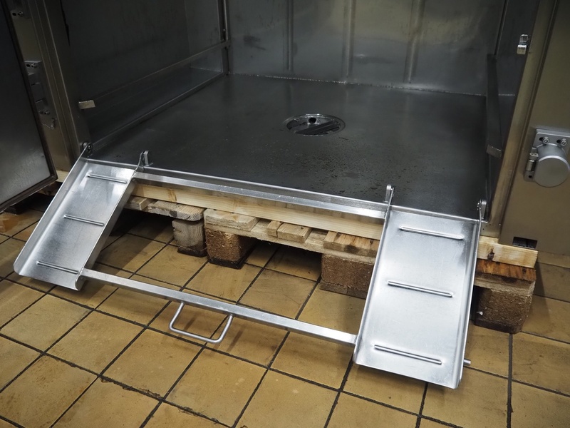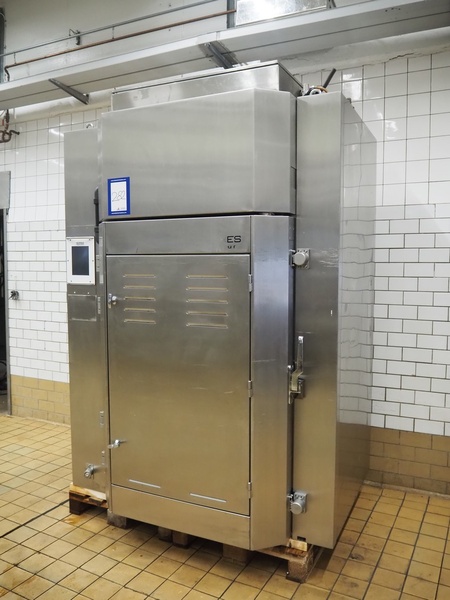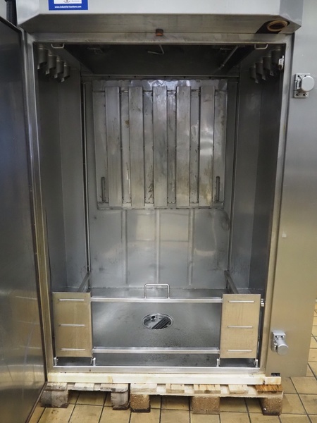 Kerres smoking chamber with integrated smoke generator for wood chips, inside dimensions: 1040 mm x 940 mm x 1605 mm, total dimensions: 1700 mm x 1350 mm x 2450 mm.