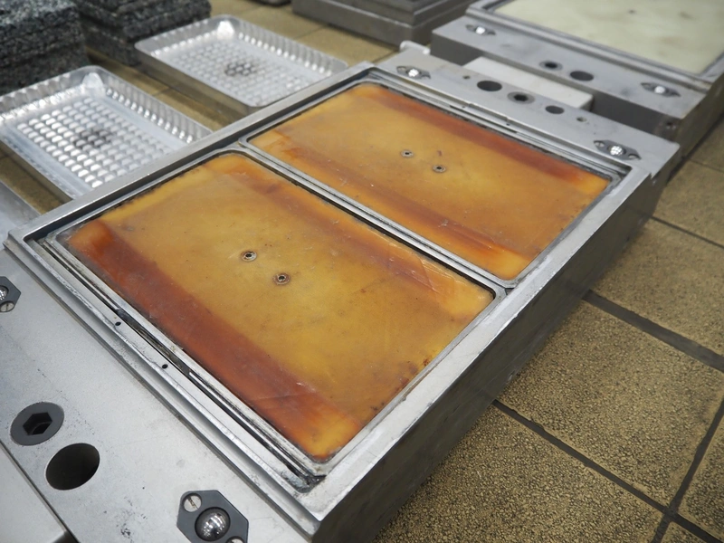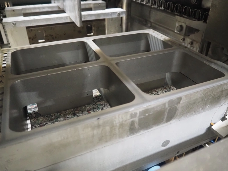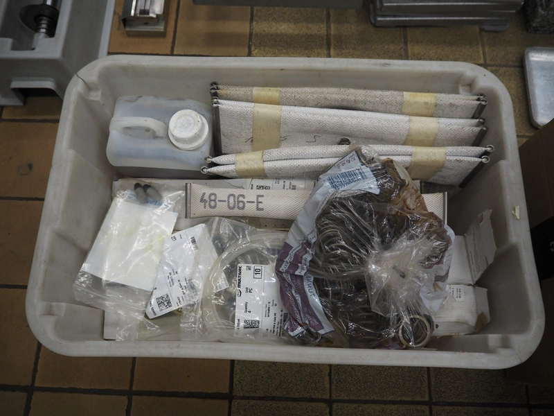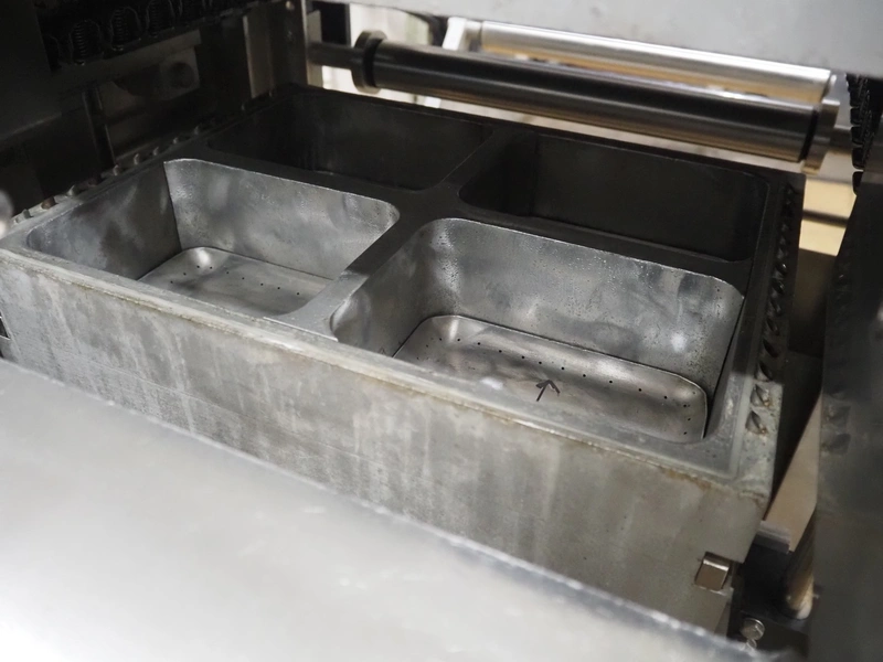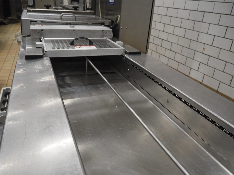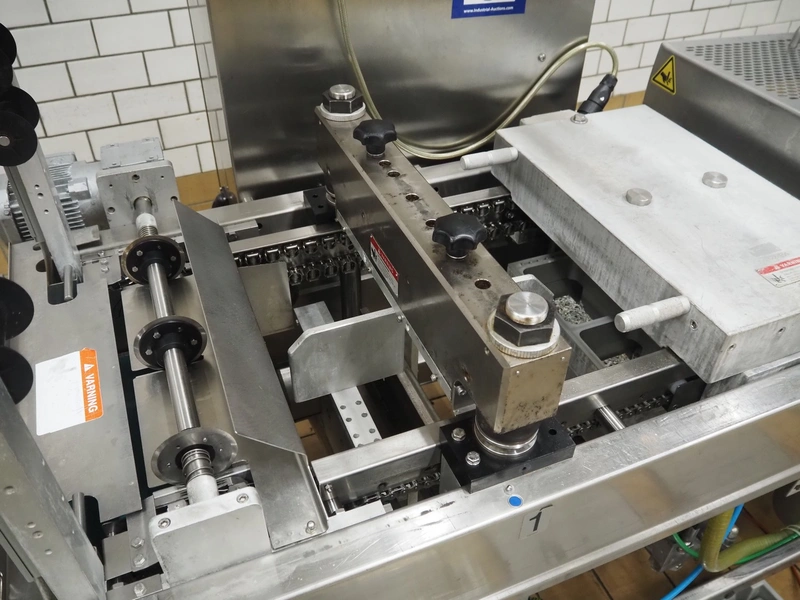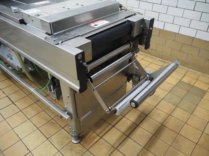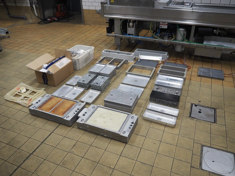 Multivac thermoformer, type: R140, machine number: 342, year of construction: 2005, 400 V, 3 Ph, 50 Hz, 22 A, 7.5 kW, dye: (4x) 130 mm x 175 mm, plastic outfeed belt, belt width: 380 mm, with Busch vacuum pump, type: RA 0100 B, total dimensions: 4000 mm x 1050 mm x 1900 mm. Including large amount of parts, extra dye sets, dimensions: 283 mm x 365 mm, (2x) 283 mm x 175 mm.