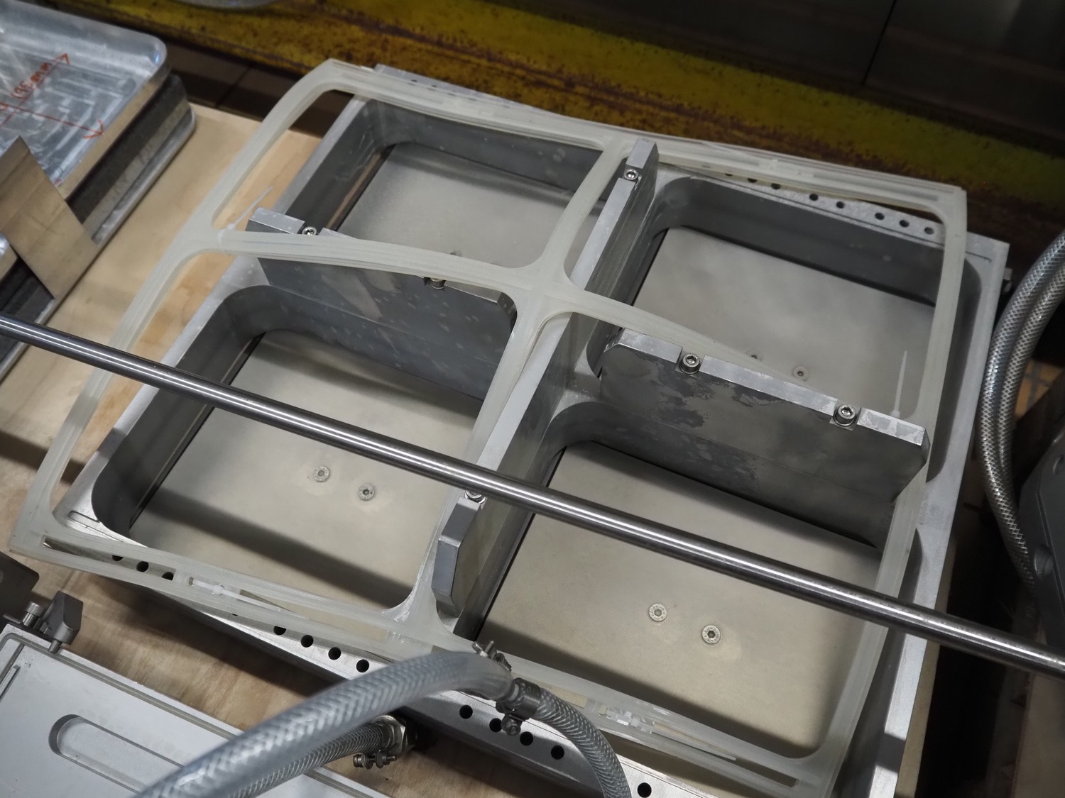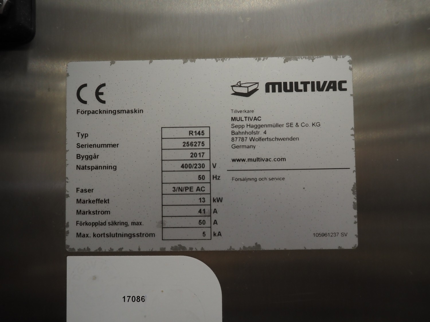 Multivac thermoformer, type: R145, serial number: 256275, year of construction: 2017, 400/230 V, 3 Ph, 50 Hz, 41/50 A, 13 kW, index: 460 mm, bottom film width: 463 mm, top film width: 460 mm, dimensions dye: (2x) 495 mm x 200 mm, plastic mesh outfeed belt, belt width: 420 mm, total dimensions: 7100 mm x 1150 mm x 2250 mm. Including 4 pallets with parts, among others: form for cheese, dimensions form: 190 mm x 150 mm, extra dye: (4x) 235 mm x 195 mm, total dimensions pallets (1x) 1900 mm x 1100 mm x 1000 mm and (3x) 1200 mm x 800 mm x 500 mm.