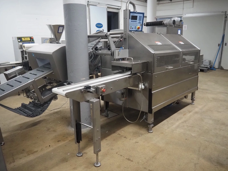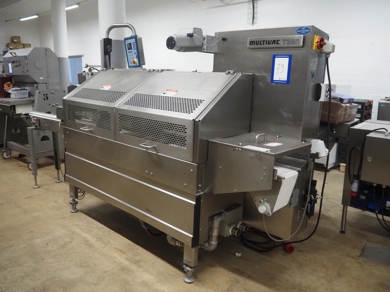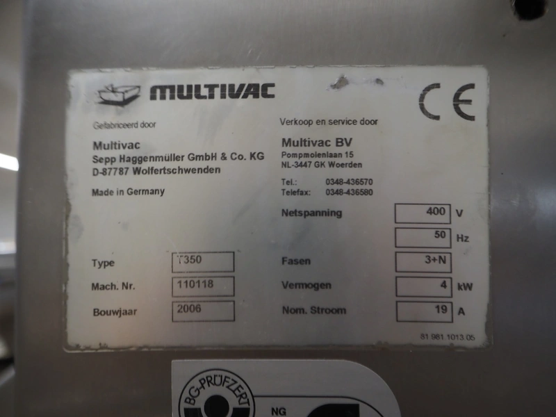 Multivac traysealer, type: T350, machine number: 110118, year of construction: 2006, 400 V, 3 Ph, 50 Hz, 19 A, 4 kW, dye: (2x) 195 mm x 150 mm, plastic mesh belts, belt width: 200 mm, total dimensions: 3750 mm x 1050 mm x 2100 mm.