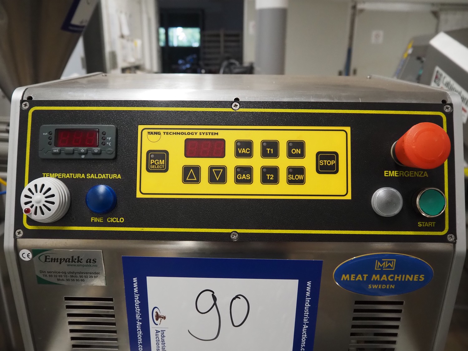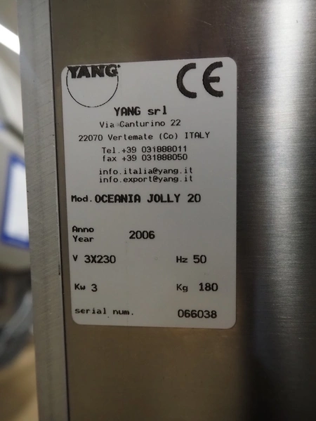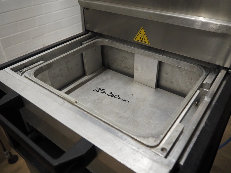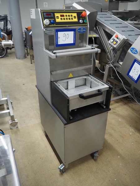 Yang Srl mobile traysealer, dye: 335 mm x 260 mm, total dimensions: 800 mm x 450 mm x 1460 mm. Including extra dye sets, dimensions: (4x) 170 mm x 125 mm, (2x) 230 mm x 160 mm.